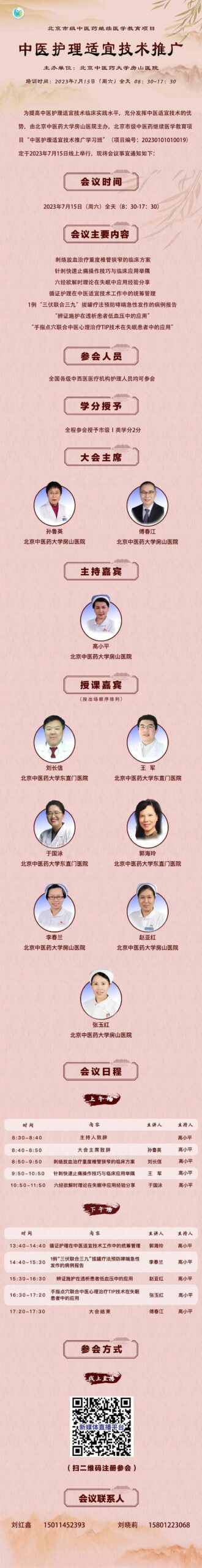 为提高中医护理适宜技术临床实践水平,充分发挥中医护理适宜技术的优势,促进中医护理适宜技术的传承发展创新,由北京中医药大学房山医院主办的北京市级中医药继续医学教育项目“中医护理适宜技术推广学习班”定于2023年7月15日线上举行,现将会议事宜通知如下: