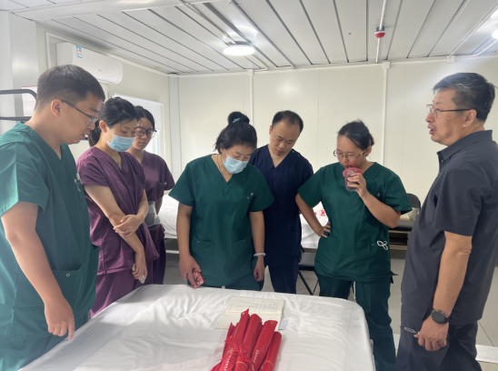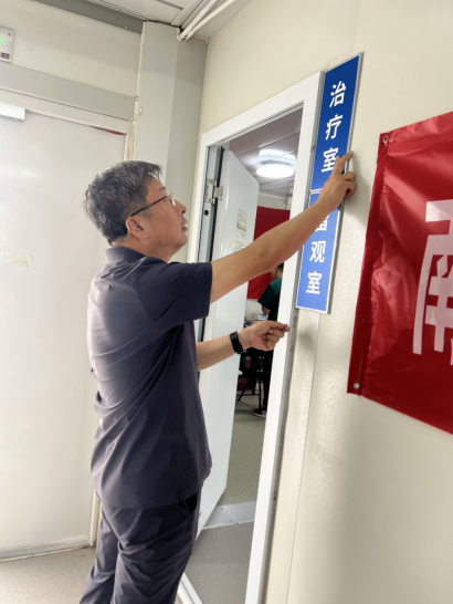 在卫生健康委领导的组织下,医疗队在安置点成立临时医院,由毛廷森副院长任临时医院院长兼党支部书记,李永甲医生担任医疗组组长,医疗队成员还有良乡医院、良乡地区社区卫生服务中心和琉璃河社区卫生服务中心的医护人员。区委卫生健康工委书记、区卫生健康委主任王耕同志亲手把党旗送到毛廷森院长手中,叮嘱临时医院要做好医疗保障工作,把党旗插到群众最需要的地方。