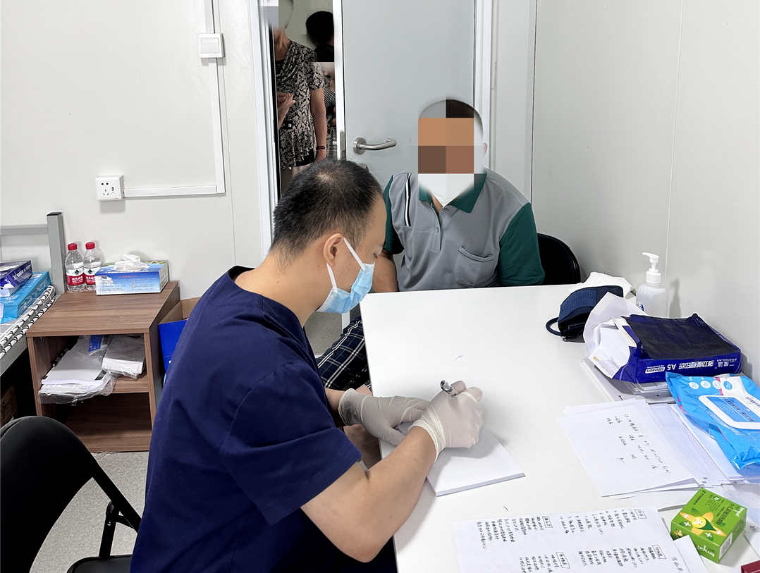 完成第一天的摸排工作后,医疗队每天安排人员接诊需要医疗救助人员,包括发热、腹泻、皮疹、头晕、头痛等患者,平均每天要接诊80余名患者来诊。许多慢病的患者由于转移时来不及带药,由专人为慢病患者开具药物,保证在安置点能放心吃上慢病药物,另外每天有一名医生对重点人员巡诊。李永甲医生巡诊中发现一位癫痫患者,长期口服卡马西平,手中的药物仅够当日服用,当得知安置点没有卡马西平时,患者非常担心停药后癫痫发作,请示毛廷森院长后,毛院长经过和医院协调,当天就为患者送来了卡马西平,当把药物送到患者手中时,患者终于露出放心的笑容。