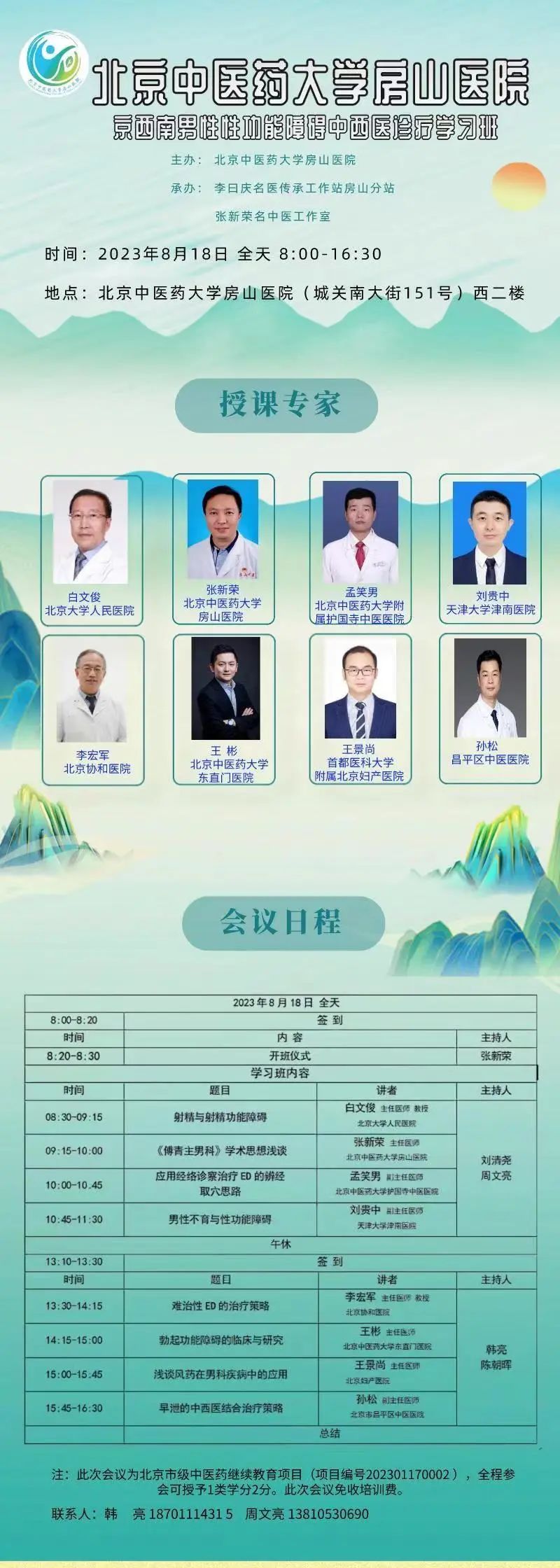 男性性功能障碍发病率高,不仅影响到男性自身的身心健康,同时也是造成家庭不和谐的重要原因。由北京中医药大学房山医院主办,李曰庆名医传承工作站房山分站、张新荣名中医工作室承办的“京西南男性性功能障碍中西医诊疗学习班”定于2023年8月18日在北京中医药大学房山医院举办。本次培训班邀请国内知名泌尿男科中西医专家进行授课,重点讲授通过中西医融合提高男性性功能障碍相关疾病的临床疗效的思路与方法。以期提升医务工作者对男性性功能障碍相关疾病的认识水平及应对能力。诚挚邀请各位同道及精英参加!