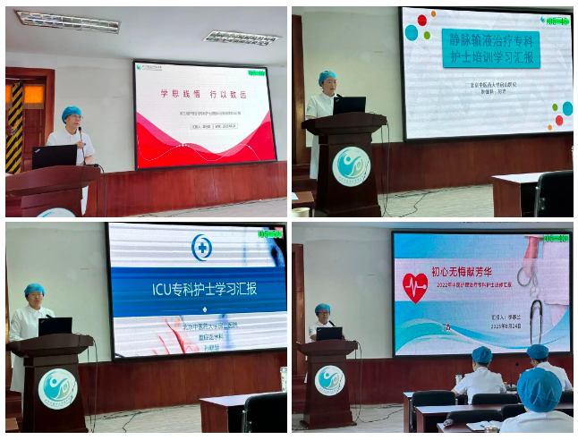 本年度已经有16名护士完成了ICU、呼吸、护理管理、急诊、静疗、伤口造口失禁等12个专科的学习任务。汇报过程中专科护士们分别就学习期间的所见、所闻、所学、所感、所悟通过PPT形式图文并茂、生动形象地进行汇报分享。她们结合各自的专业特点和学习方向,从不同角度展示了学习培训医院优美的环境、良好的团队建设、专业的技术、先进的护理理念、科学规范的管理方式、细致入微的人性化服务和优质的教学理念等。并结合自身和科室实际情况,完成了学习成果因地制宜的推广应用计划并进行了计划实施的可行性分析。