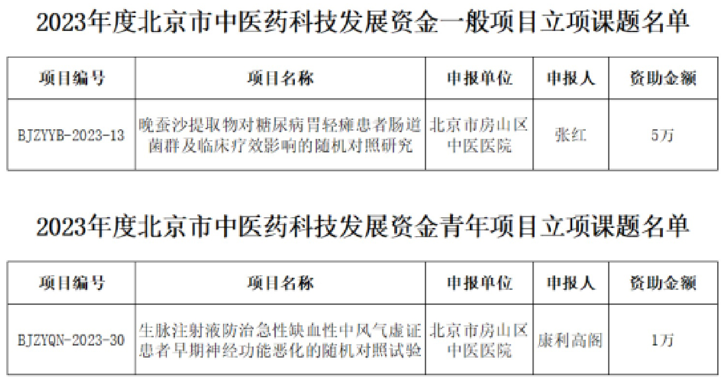 2023年8月29日,北京市中医管理局发布了2023年度北京市中医药科技发展资金项目立项课题通知,经个人申报、单位推荐、形式审查、专家评审等程序,共立项137个项目。北京中医药大学房山医院共有2个项目获得立项,张红主任医师获一般项目立项,急诊科康利高阁主治医师获青年项目立项。