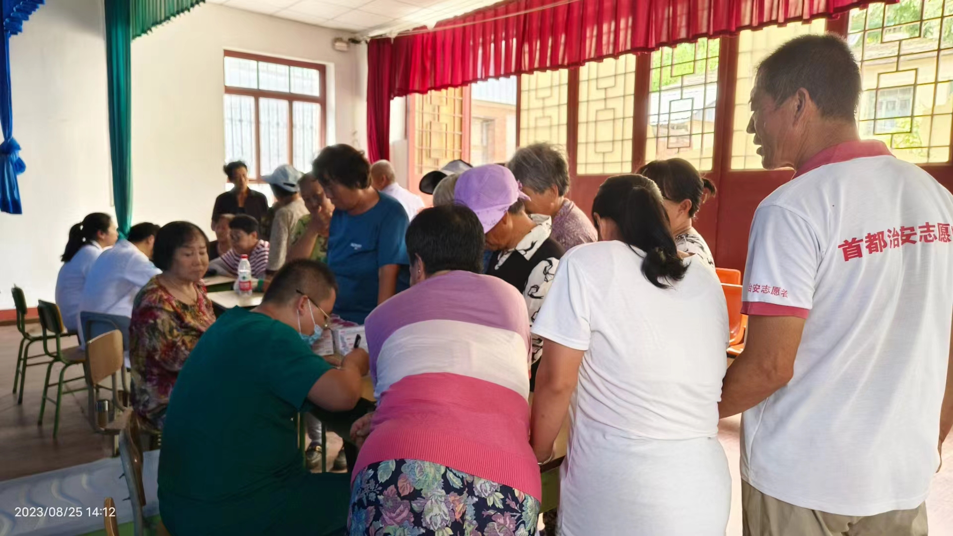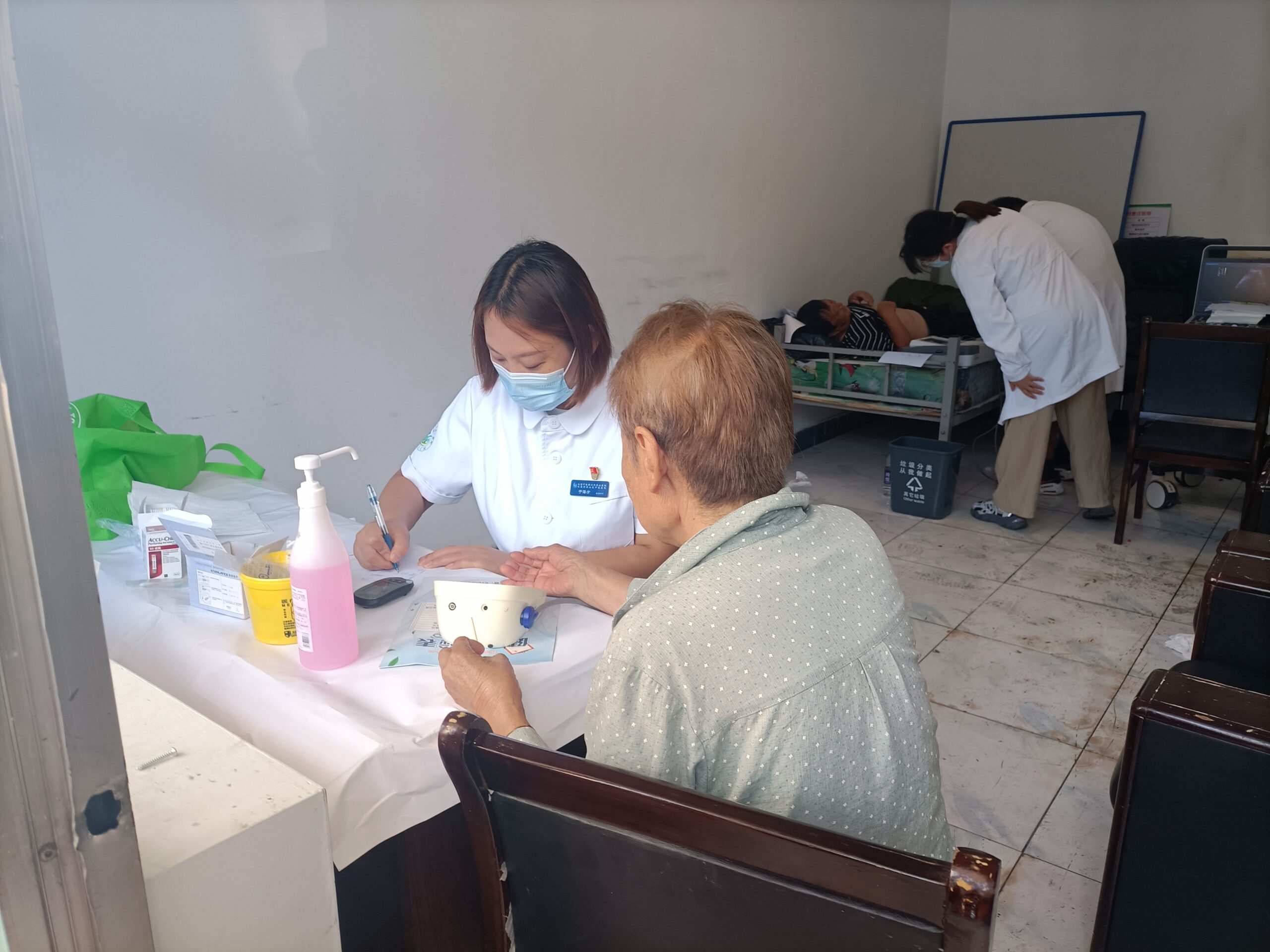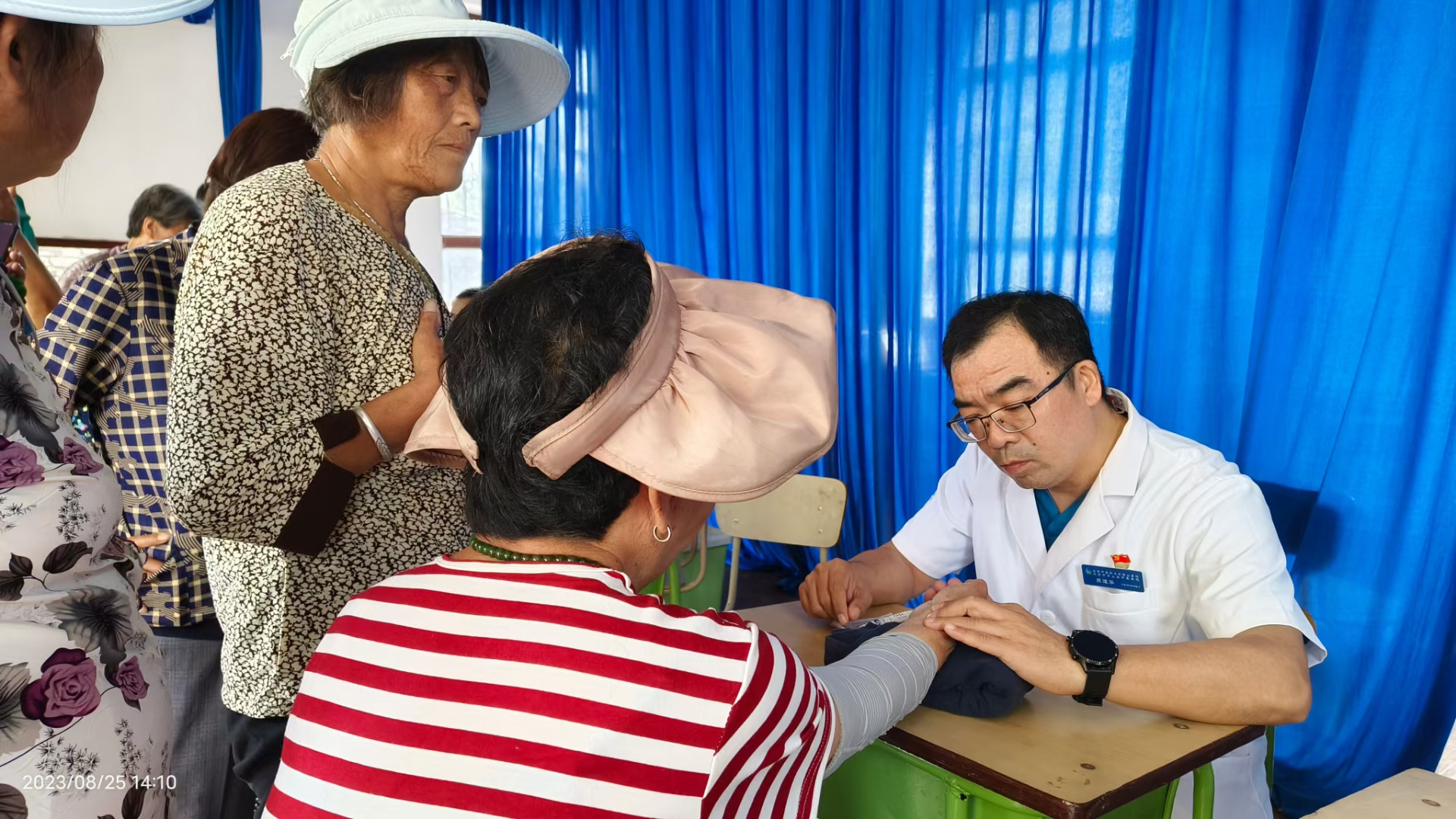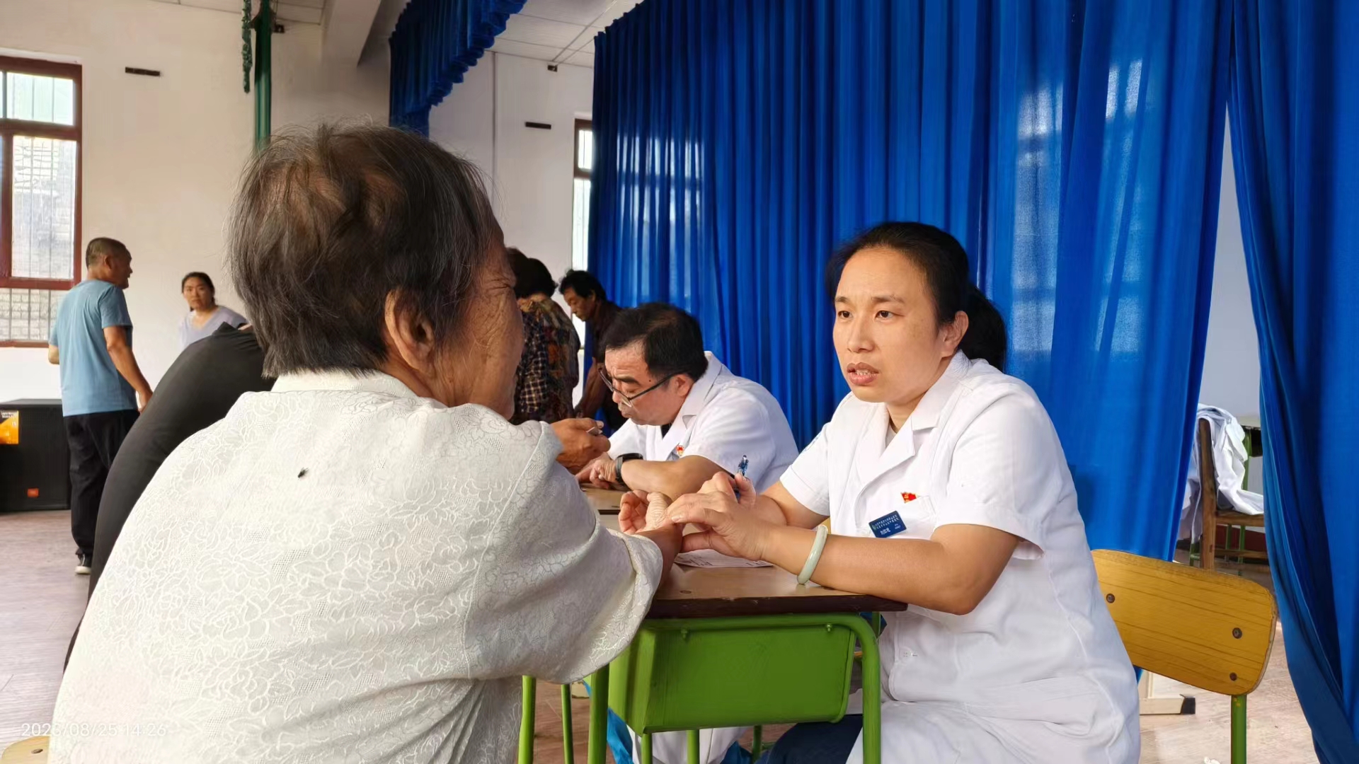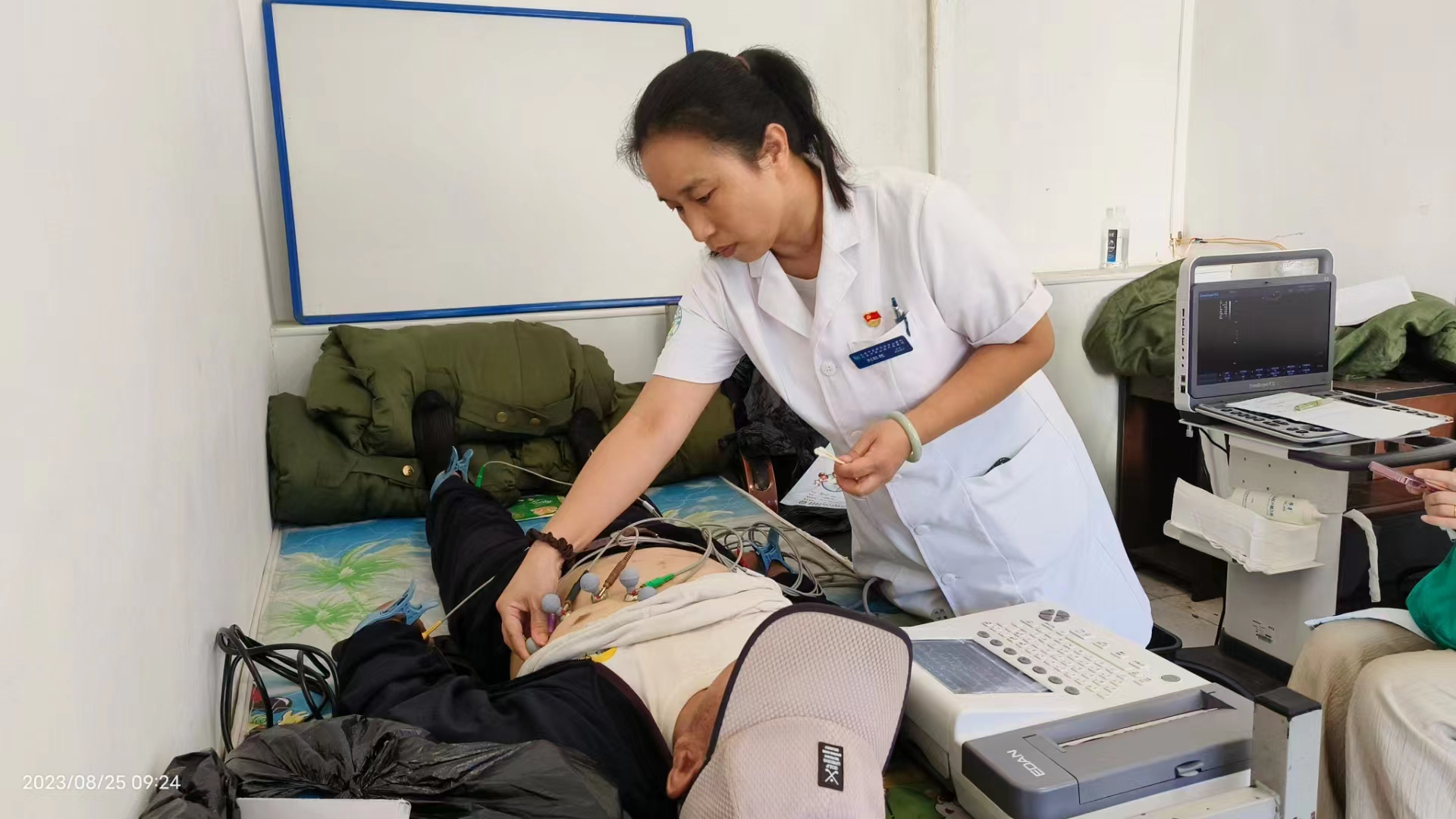 在义诊现场,中医专家为村民耐心细致的把脉问诊,开具处方,耐心地为就诊村民答疑解惑。并针对病情,免费的为他们做穴位贴敷。流动医院医务工作者为居民进行测量血压、血糖,做B超、心电图,针对村民个体情况,讲解慢性常见疾病的防治知识。中午大家匆匆吃口饭,立刻赶往史家营乡柳林水村。内科第三党支部书记苏连华为村民诊治,同时给受灾村民做相关心理疏导,积极宣教洪灾后容易并发哪些疾病及防治措施。