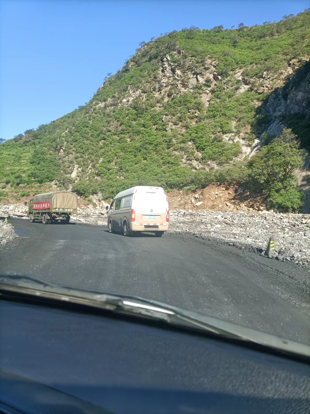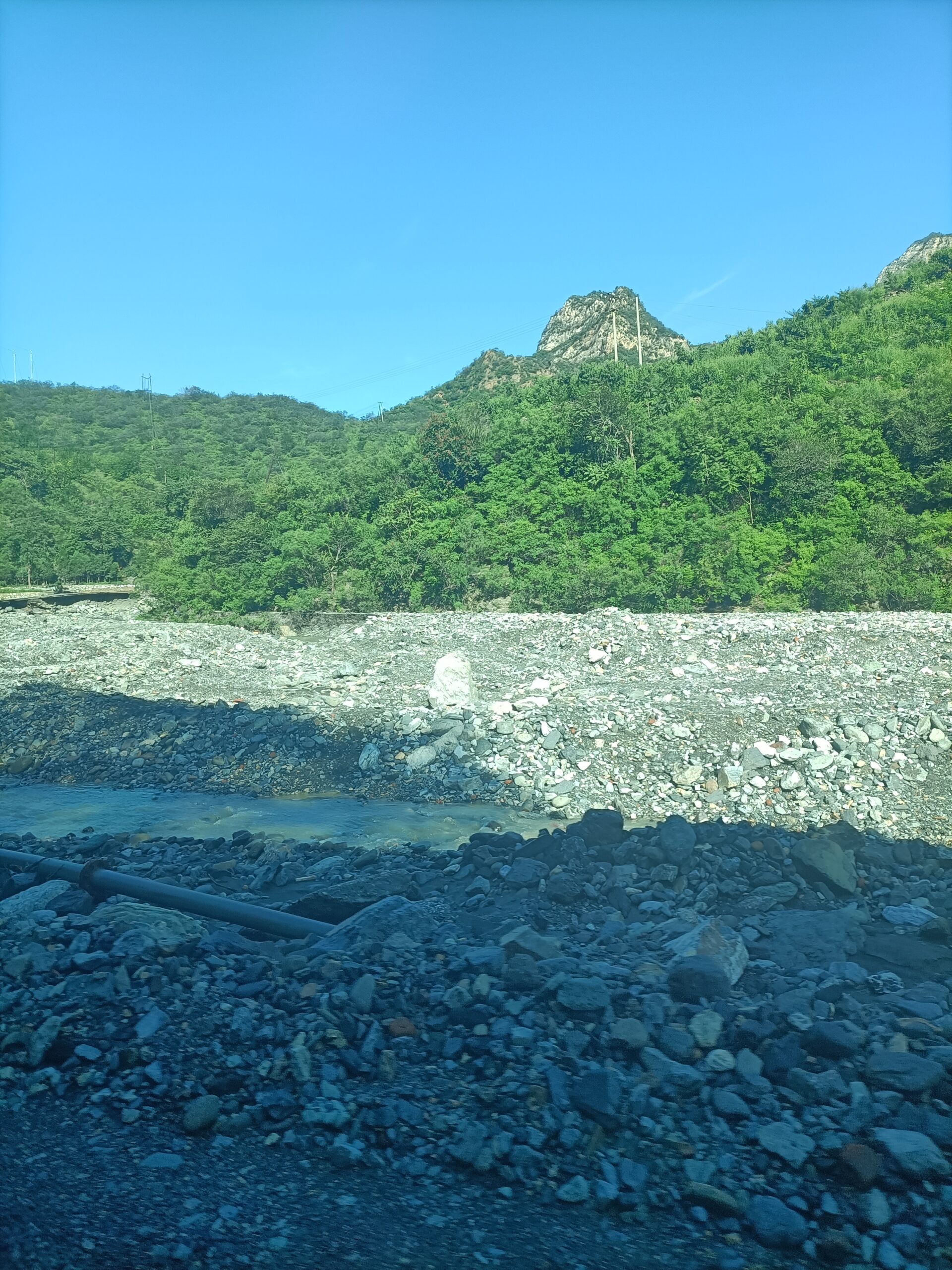 早晨七点大家准时出发,沿途道路仍未完成恢复,解放军战士正在抢修部分道路。路边河道里仍有从山上冲下来的大石头,也能看见部分山体被削掉三分之一,可见当时洪水有多猛烈。山里面的路不能走大车,只能走120这样的小车,路途非常难走,有的人晕车,有的人呕吐,经过两个半小时的颠簸,终于到达了史家营乡青林台村。
