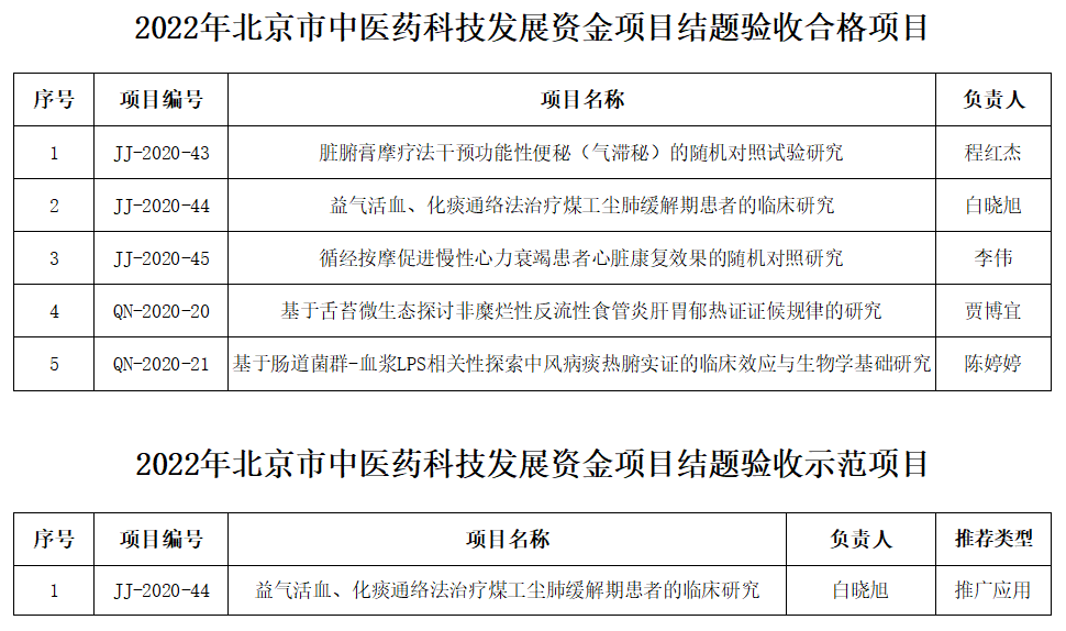 近日,北京市中医管理局公布了2022年北京市中医药科技发展资金项目结题验收结果,经过线下评审答辩,共有121个项目合格,并从合格项目中遴选出示范项目16项。北京中医药大学房山医院5项科研课题全部顺利通过结题验收,并有1项被评选为示范项目。