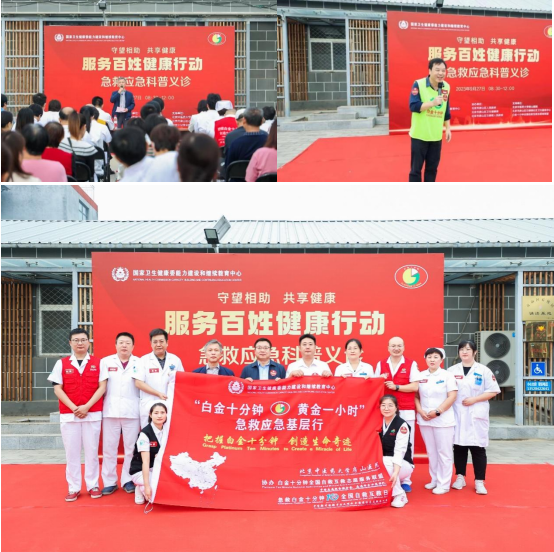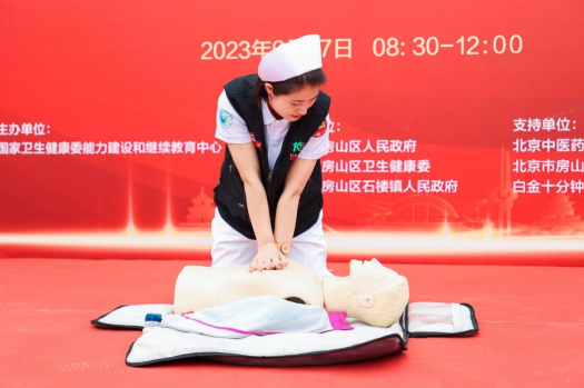 为进一步贯彻落实《关于开展2023年”服务百姓健康行动”全国大型义诊活动周的通知》精神,国家卫生健康委能力建设和继续教育中心主办的“白金十分钟·黄金一小时”急救应急基层行活动”于2023年9月27日上午在北京市房山区石楼镇坨头村文化活动中心开展。本活动由房山区人民政府、房山区卫生健康委、房山区石楼镇政府等单位协办,北京中医药大学房山医院、石楼镇社区卫生服务中心、白金十分钟全国自救互救志愿者联盟等单位支持。