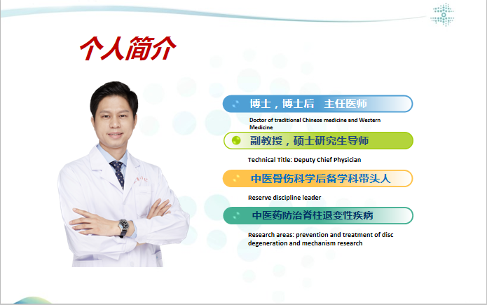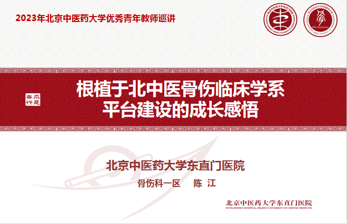 陈老师首先介绍北京中医药大学东直门医院骨伤中心的发展历程。从1958年中医正骨大师刘寿山创建东直门医院骨伤科,主张“七分手法三分药”,其清宫正骨手法别具一格,到现在由徐林教授作为学科带头人率领团队在国内率先开展脊柱非融合手术、首次提出颈椎“自然高度”外科手术理念,带领东直门骨伤科享誉全国。传承创新65年过程中,引入新元素、多元化发展,做到“向经典致敬,与时代同行”。在高平台发展、强团队合作中,陈老师自身注重学习交流,紧跟团队步伐,不断精进业务能力,成为北京中医药大学“中医骨伤科学”后备学科带头人。