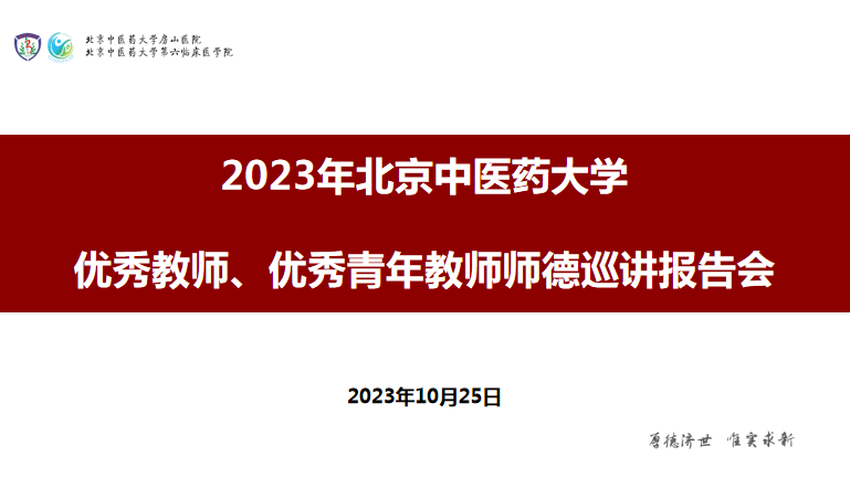 为开展好第39个教师节庆祝工作的部署,大力弘扬尊师重教传统,强化榜样引领感召,挖掘宣传身边可学可做的教师模范典型,让身边人讲好身边事、用身边事激励身边人,引导广大教师坚定理想信念、厚植爱国情怀、涵养高尚师德,根据《2023年北京中医药大学教师节庆祝活动方案》,北京中医药大学组织开展2023年优秀教师、优秀青年教师师德巡讲报告。