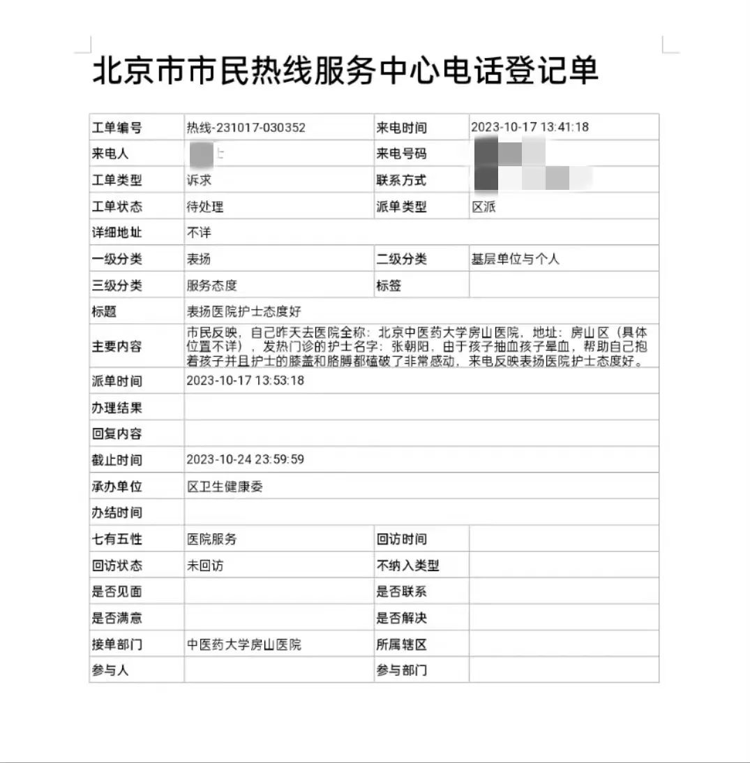 近日,北京中医药大学房山医院接到患者拨打的12345热线表扬感染疾病科护士张朝阳,对她的护理的工作予以肯定。家属的认可与表扬是我们继续行使使命最大的动力,也是我们源源不断进步的源泉。