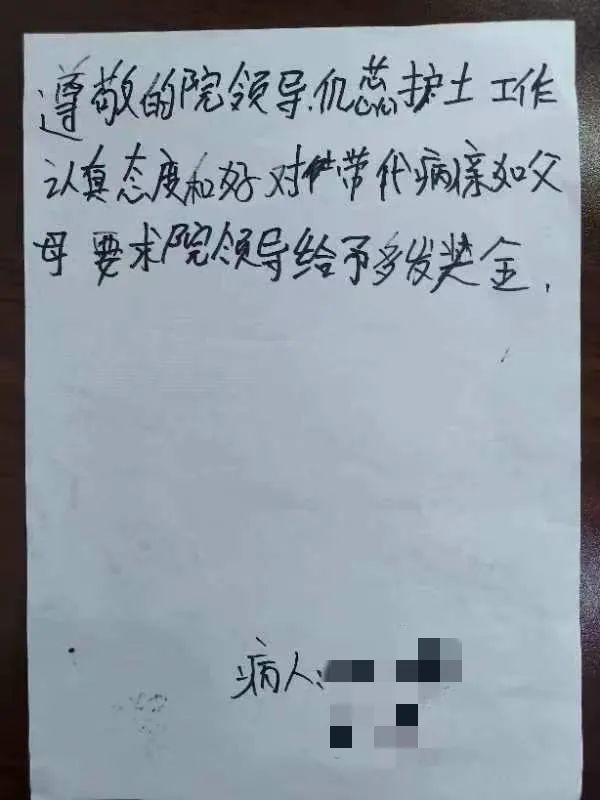 林大爷和梁大叔是同病室的病友,他们两个的病也是一样的,突如其来的病搞的这两人很郁闷,每天情绪不高,对治疗护理措施也只有输液配合的还行,其他一律应付,不按时服药,吃饭不忌嘴,吸氧任务也是三天打鱼两天晒网。他们的责任护士仉蕊很快发现这两个落后分子,别看她小小的个子,却拥有最热情的爱心。在大爷们头晕不舒服的时候帮助打热水,扶起吃药,监督老哥两控制饮食的时候又变得严厉而认真。在她下班前他们的暖瓶里一定是满满的水。在仉蕊如亲孩子般的照顾下这老哥两也很快康复了,他们一起出院了,在出院前用治疗清单的背面写了表杨信,简单质朴的话无不表达着对仉蕊的认可。