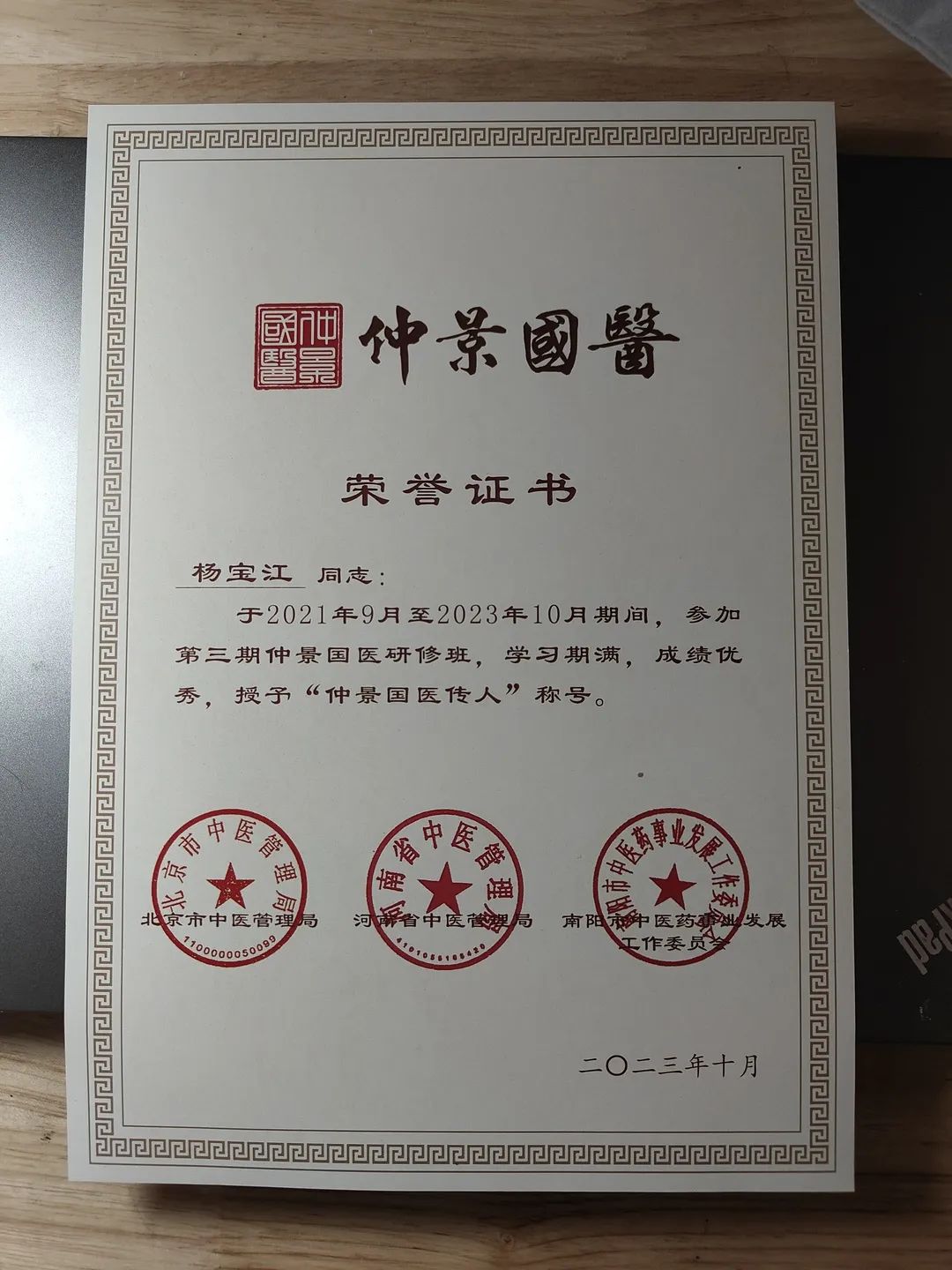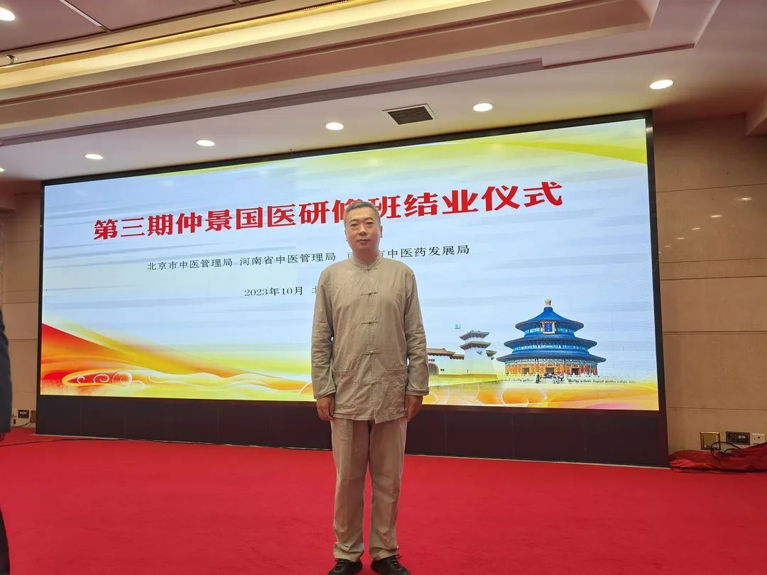 2023年11月1日,第三期仲景国医研修班结业典礼在京举行。北京中医药大学房山医院肺病二科杨宝江医生荣获“仲景国医传人”称号。