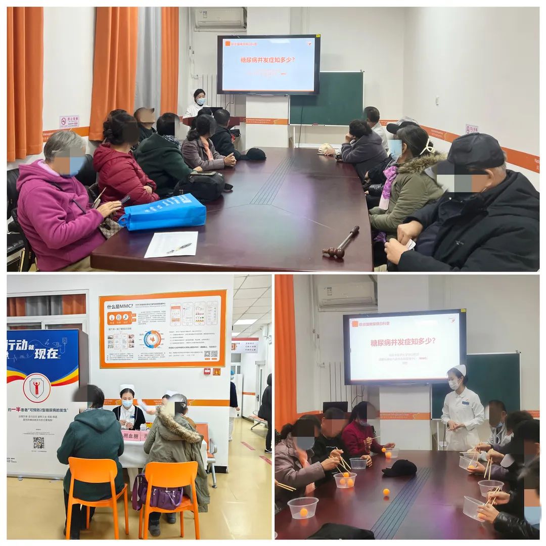 MMC会议室内,刘娜护士从糖尿病的危害入手,向患者介绍糖尿病的早期表现、并发症及糖尿病的健康生活方式,并借助并发症体验趣味游戏,使患者亲身体验了糖尿病周围神经病变带来的感受。