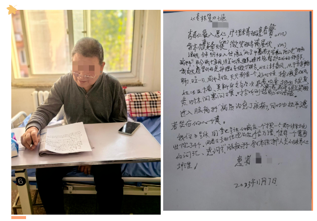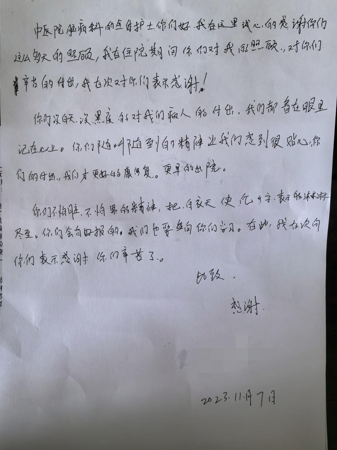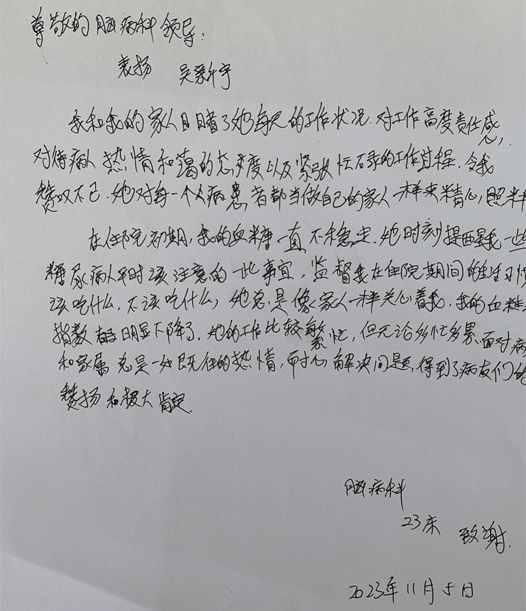 郝老师是一位脑病科住院中风患者,入院时,老人家病情危重,不能进食,大小便失禁,每天要不停的吸痰,给予翻身叩背,经过几个月的悉心护理,郝老师的病情得到了控制,正在慢慢康复,从使用胃管、尿管到自主进食,搀扶入厕,从锻炼捡黄豆到可以提笔给我们写表扬信……今天郝老师说:“感谢各位白衣天使,住院的这段时间对我的照料,我从刚开始只能在床上躺着,什么都做不了,慢慢的现在能翻身,吃饭,下床活动,现在都能写字了,你看这是我给大家写的表扬信。在住院的这段时间,我发现咱们科室特色的中医护理操作开展的非常棒,操作规范而且动作轻柔。并且大家的人情味也特别足,护士经常和我聊天,鼓励我,每天都夸我,一点一点看着我进步。咱们脑病科的护士真正做到了白衣天使无限爱心,关爱病人胜似亲人。”