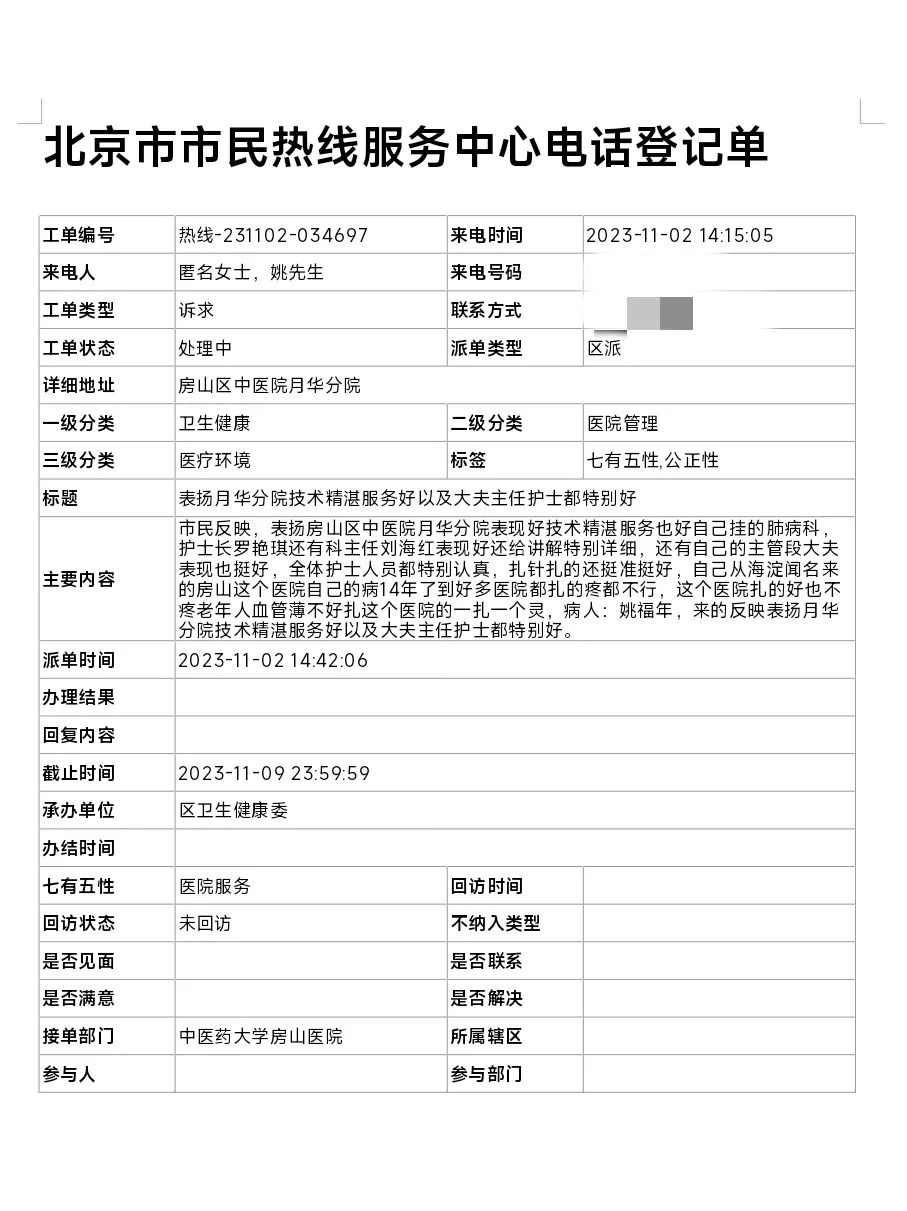 近日,北京中医药大学房山医院月华分院接连收到患者及家属的表扬信、12345表扬工单,表达对医护人员精湛的技术,优质的服务的信任和感谢。