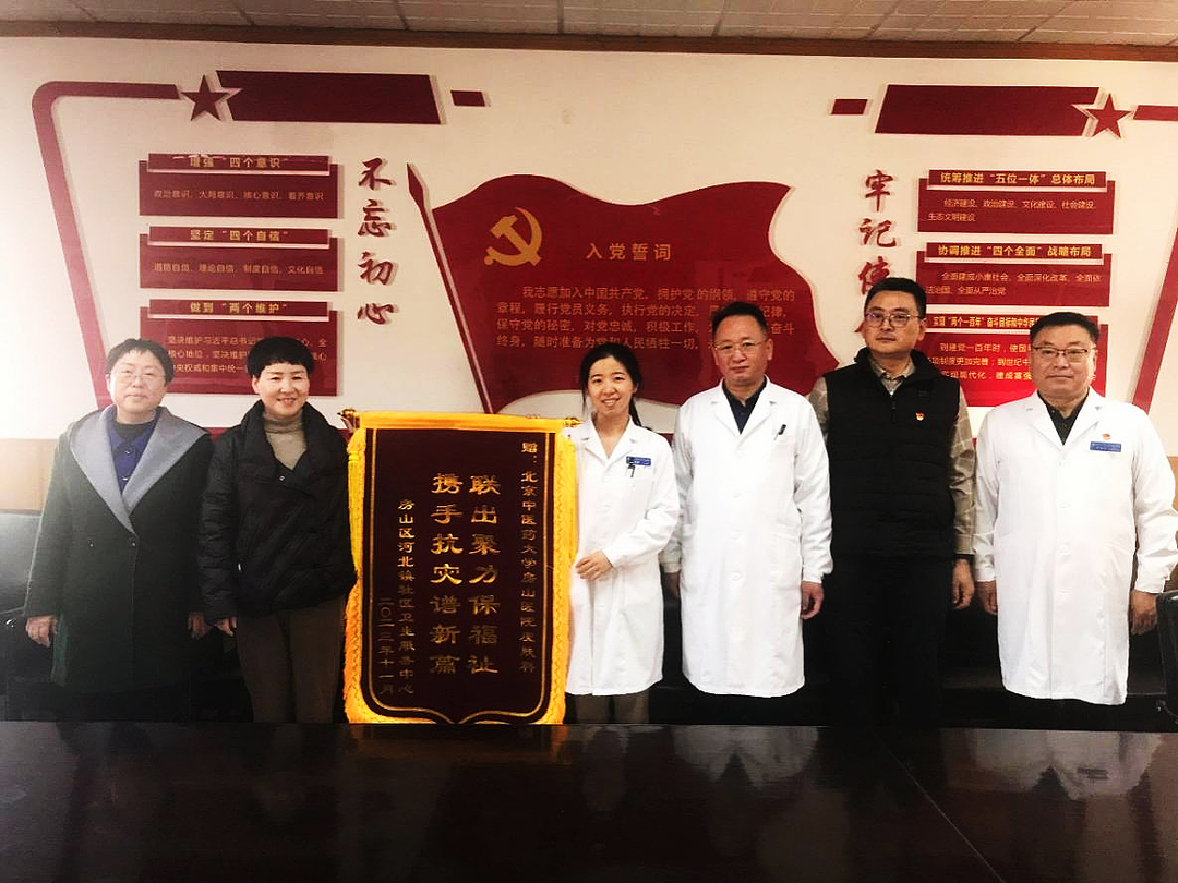 2023年11月20日,河北镇社区卫生服务中心丁海等院领导来到北京中医药大学房山医院,向皮肤科赠予“联出聚力保福祉,携手抗灾谱新篇”的锦旗,感谢皮肤科在暴雨灾情面前给予医疗支援帮扶。
