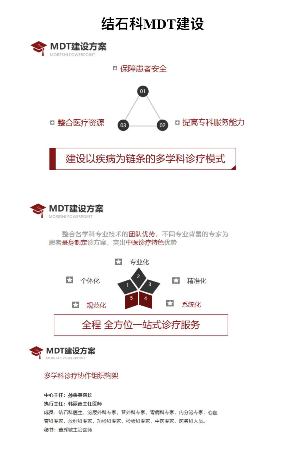 结石病MDT门诊就是为整合医疗资源,提高专科服务能力,保障患者安全,建设以疾病为链条的多学科诊疗模式,整合各学科专业技术的团队优势,不同专业背景的专家为患者量身制定诊疗方案,突出中医诊疗特色优势,为患者提供专业化,精准化,系统化,个体化,规范化和全程,全方位一站式诊疗服务。