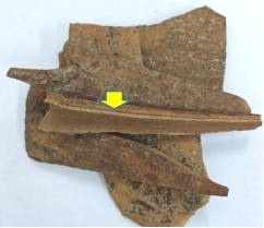 呈槽状或卷筒状,外表面灰棕色,稍粗糙,有时可见灰白色的斑纹;内表面红棕色,略平坦,划之显油痕。质地硬而脆,容易折断,断面有一条黄棕色的线纹。气香浓烈,味甜、辣。