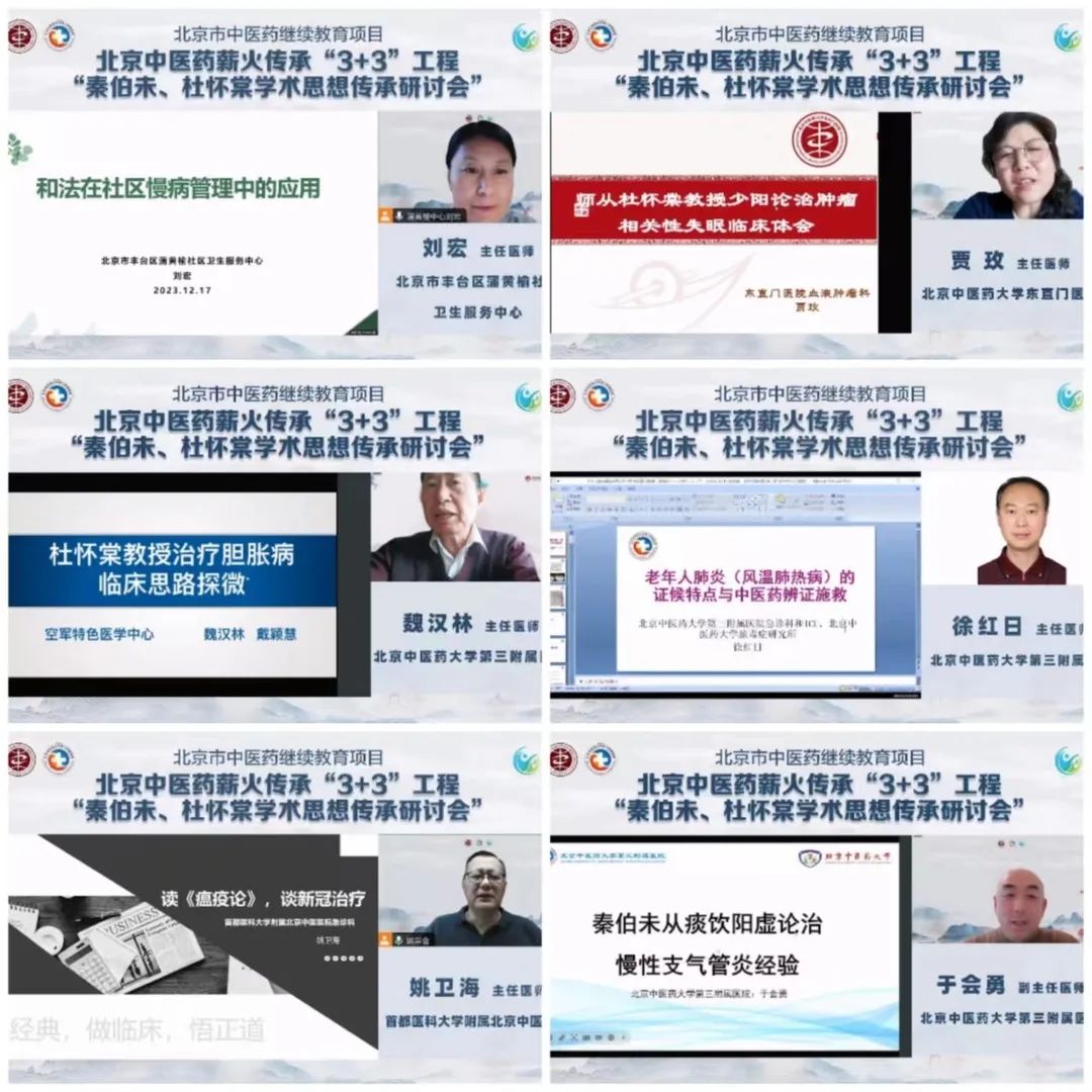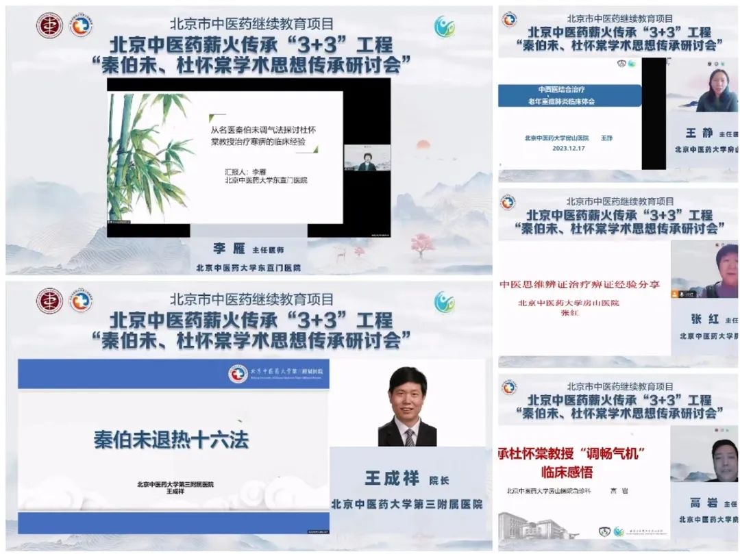 2023年12月17日,北京中医药薪火传承“3+3”工程——秦伯未、杜怀棠学术思想传承研讨会线上顺利召开。北京中医药大学东直门医院院长王显、北京中医药大学房山医院院长孙鲁英等领导为研讨会开幕式致辞。