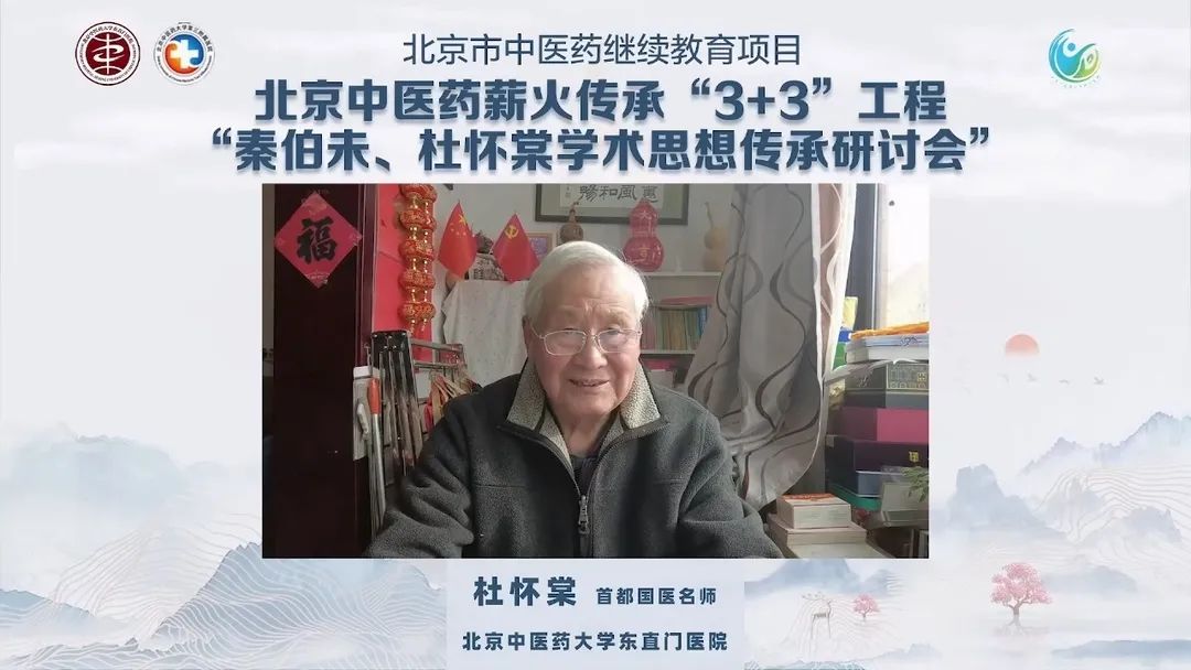 本次研讨会由北京中医药薪火传承“3+3”工程——秦伯未名家研究室、杜怀棠名老中医工作室及北京中医药大学房山医院杜怀棠名老中医工作室分站联合主办,北京中医药大学东直门医院、第三附属医学院、房山医院共同承办。秦伯未名家研究室总负责人、国家级名中医、首都国医名师杜怀棠教授结合秦老学术思想、跟师临床体会及自身的患病体会做了发言。