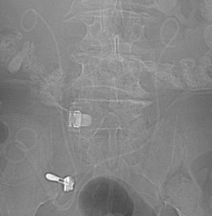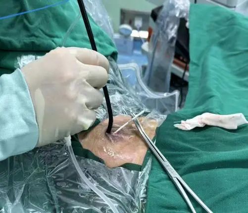 此时最好、最快的解决方案,就是经皮肾穿刺造瘘,然而患者已有一处皮肤造瘘,患者本身拒绝肾造瘘引流尿液。在崔克副主任医师的带领下,经过多次讨论,我科决定采用最新、最为巧妙的办法,经皮肤造瘘口逆行置入输尿管支架管,解决肾积水问题,化解危机。