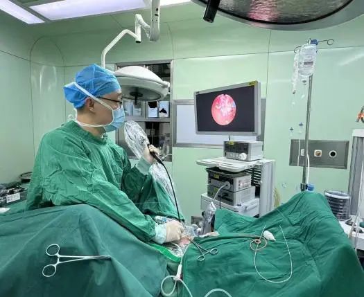 因造瘘外口与内口狭窄,手术难度极大。经过多次不断尝试,反复寻找,最终找到两侧输尿管开口。顺利放置输尿管支架管。