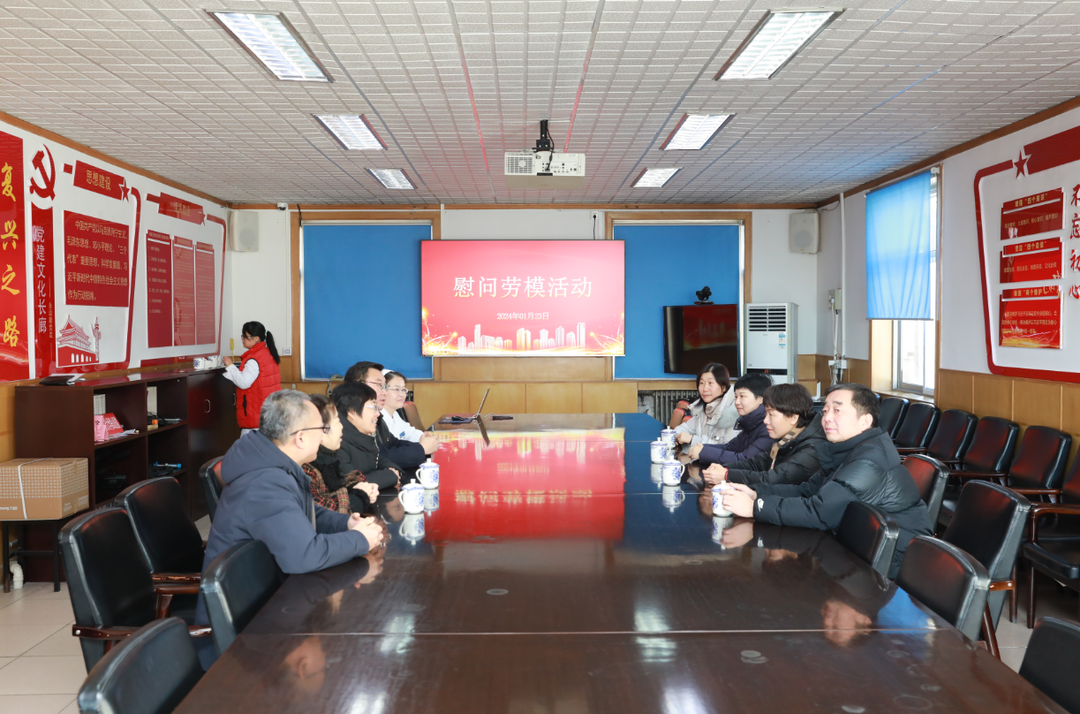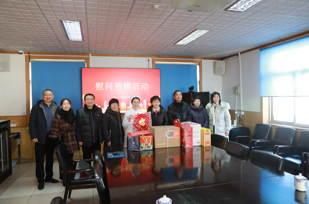 新春将至,岁寒情深,2024年1月23日,北京市房山区总工会党组书记、常务副主席王红英、副主席隗合红、副主任彭菲、权益部部长赵江萍、房山区委卫生健康工委副书记张文艳、工会主席石向红等一行9人走进北京中医药大学房山医院开展春节前走访慰问劳模活动,为坚守岗位的劳模送来慰问品及领导的关怀与祝福,医院党委书记郭书文、纪委书记程志舫陪同。
