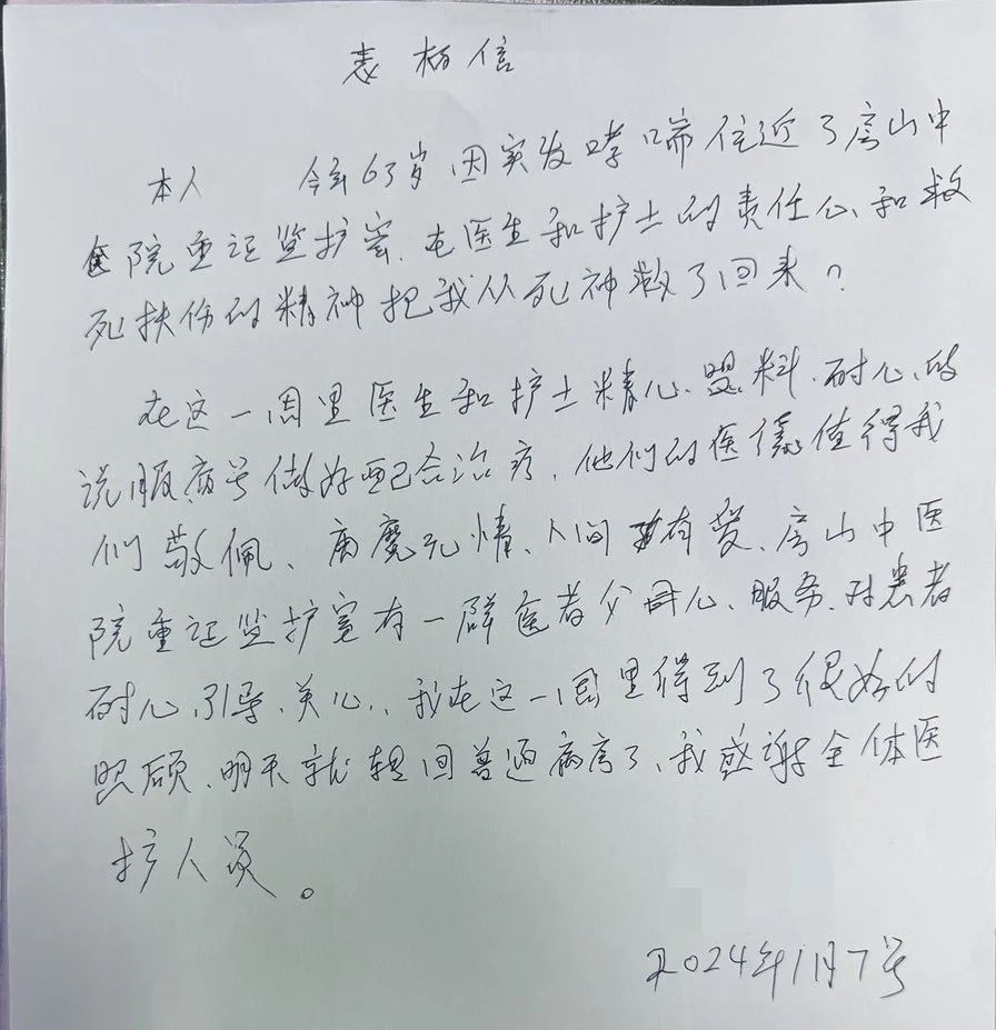 2023年,重症医学科开展无创血流动力学、俯卧位通气、空肠管置入等新技术新项目,医疗救治能力得到进一步提高;三项科研项目立项,两项专利申报,获得教学比赛二等奖和优秀教研室称号,科研教学硕果累累,医、教、研各方面都取得一定成绩。值此2024年伊始,我们便收到来自患者及家属两份“新年贺礼”。