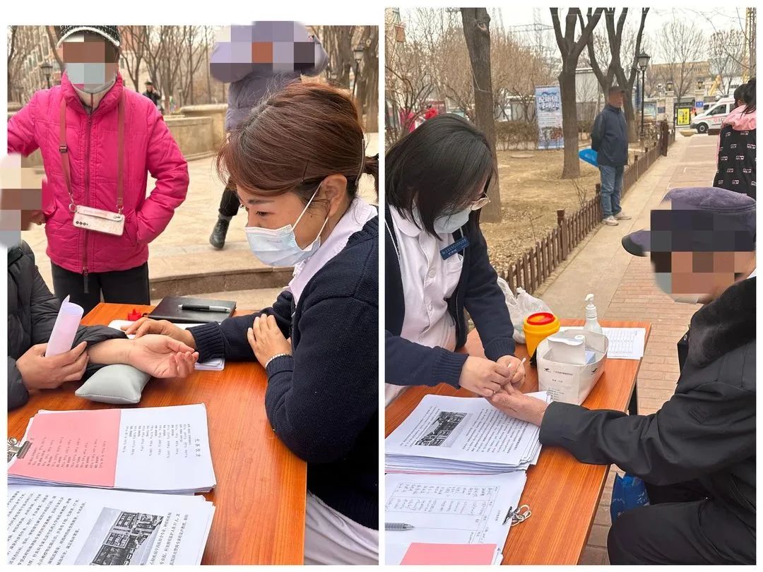 在翠林湾嘉园社区,段红蕾主治医师和丁丽丽主管护师为社区居民把脉诊疗、宣传健康知识、测血压、血糖,和社区志愿者一起开展健康教育活动。