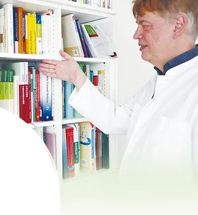 德国中医药专家、汉堡大学附属埃彭多夫医院汉萨美安中医中心主任斯文·施罗德介绍中心阅览室中的多语种中医专业书籍。