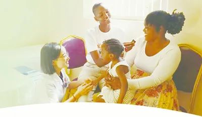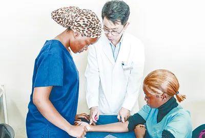 中国援津巴布韦医疗队医生胡莎(左一)为当地患者诊疗。