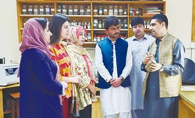 在巴基斯坦伊斯兰堡真纳大学,中医药用植物研究团队带头人穆什塔克·艾哈迈德教授(右一)向学生们介绍中医药用植物的使用方式和功效。