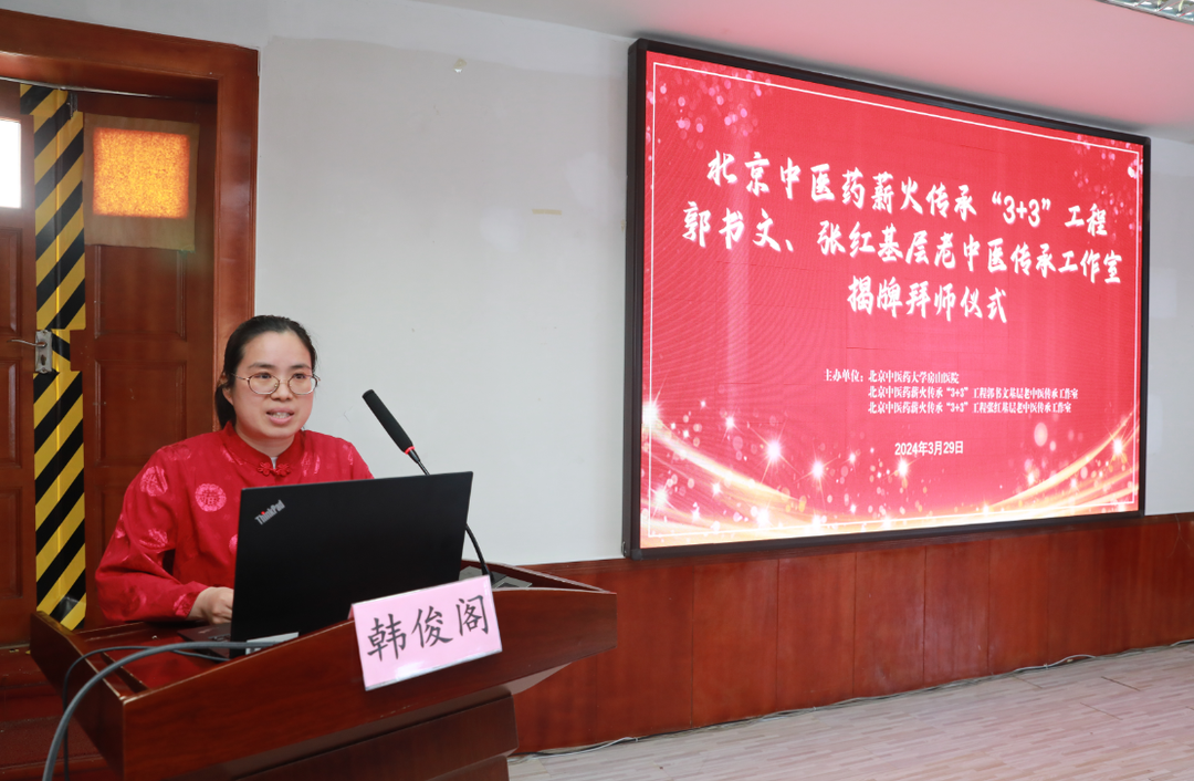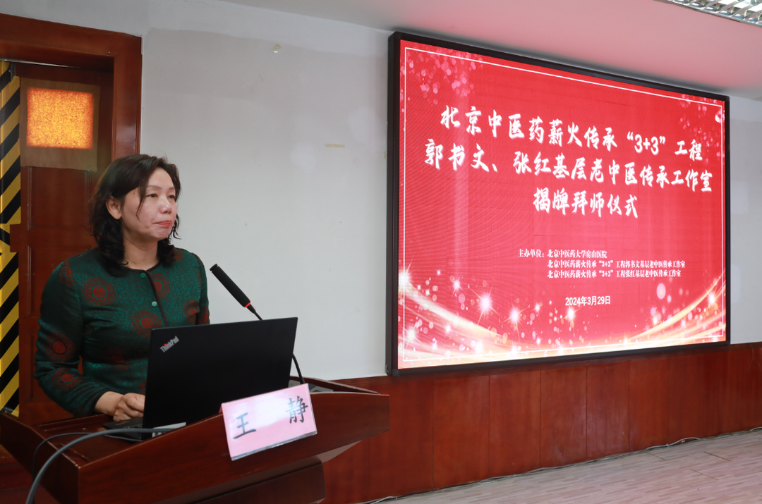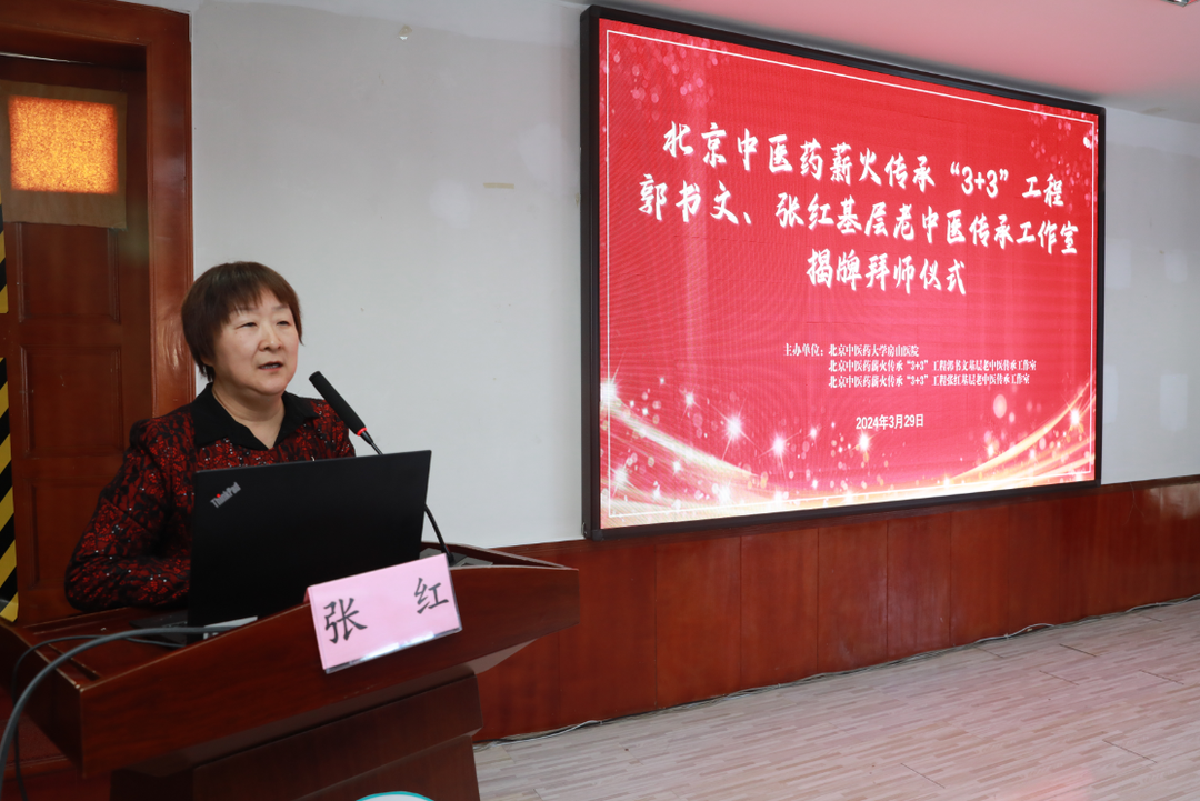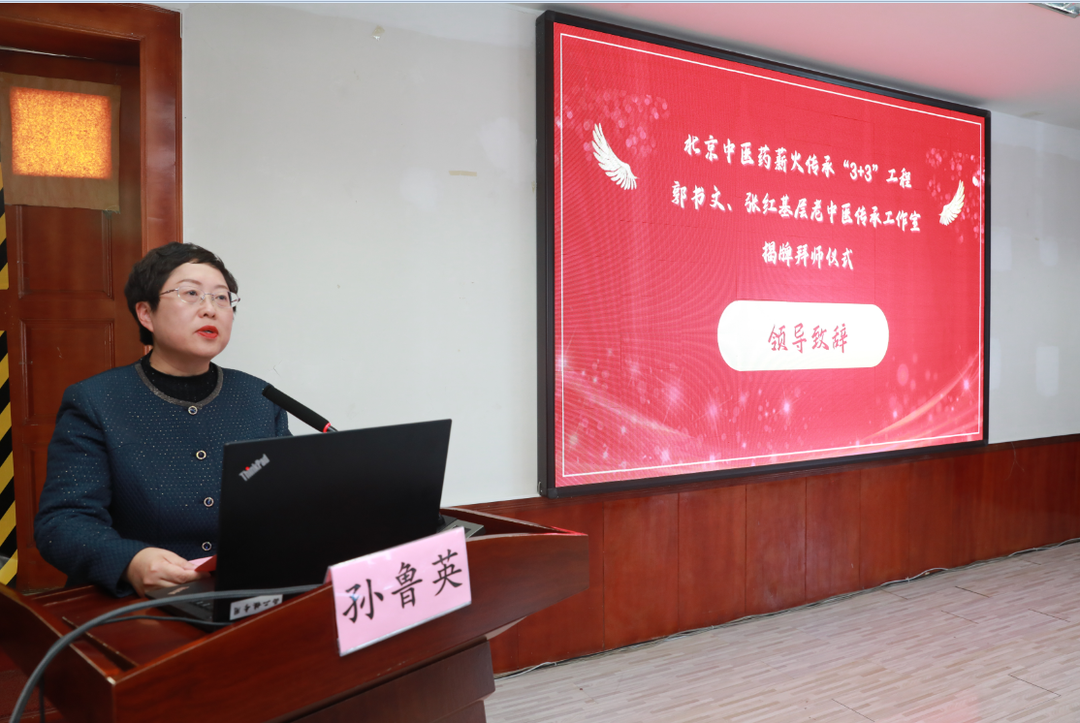 孙鲁英院长为大会致辞,她表示师承教育是中医药人才培养的主要模式,我院历来重视中医药人才培养和中医传承工作,今日北京中医药薪火传承“3+3”工程郭书文、张红基层老中医传承工作室正式揭牌,我院将以此为契机,积极开展学术交流,打造中医药高层次人才培养平台,提高医院中医药综合服务能力,为助推全民健康和中医药振兴发展贡献力量。希望各位继承人笃信好学、承接技艺,努力成长为基层中医药事业的中坚力量,为推动中医药事业发展做出贡献。
