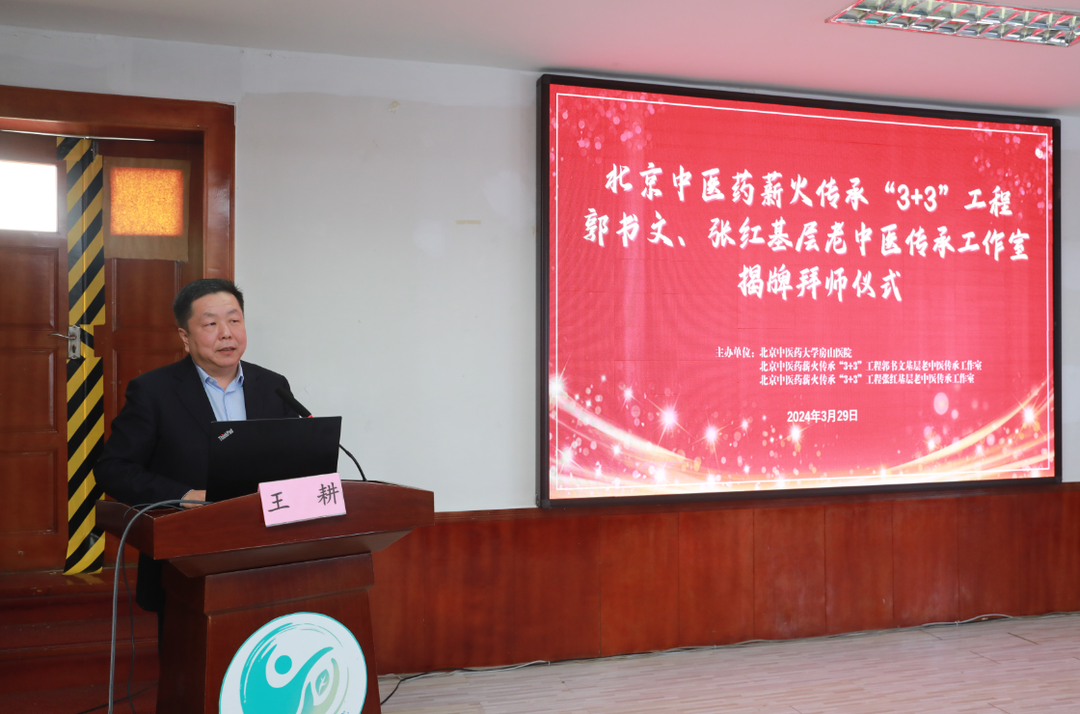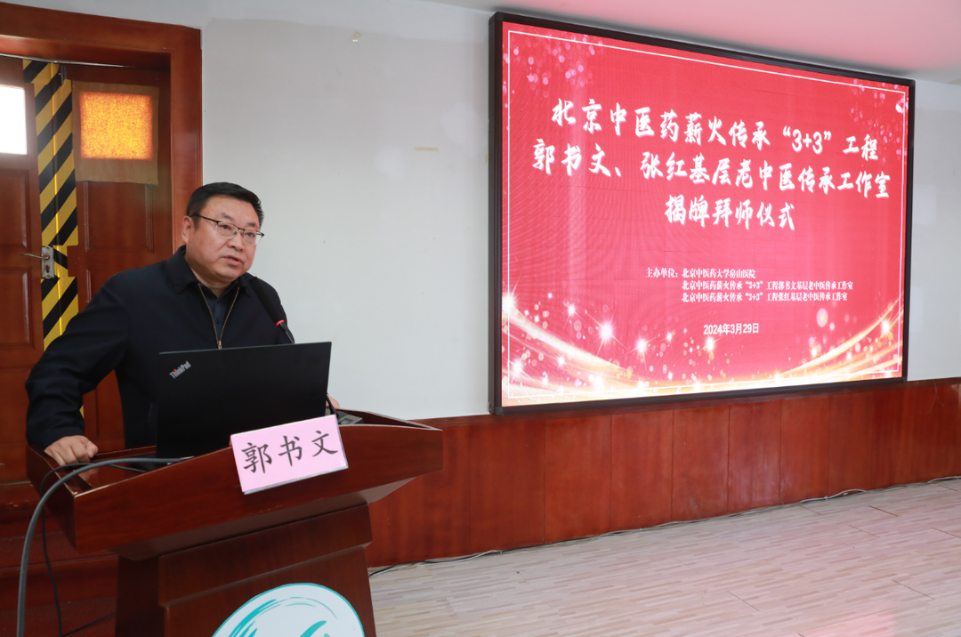阳春三月,杏林春暖,为加快首都名老中医学术经验传承,促进基层中医药服务能力提升,加快中医药人才培养,在北京市中医药管理局、房山区卫生健康委员会领导的支持下,2024年3月29日,北京中医药大学房山医院在西二楼会议室举办北京中医药薪火传承“3+3”工程郭书文、张红基层老中医传承工作室揭牌拜师仪式,同时进行名师大讲堂的首次讲课。房山区委卫生健康工委书记、房山区卫生健康委主任王耕,指导老师郭书文、张红,北京中医药大学房山医院院长孙鲁英及医院领导班子成员,临床、职能科室人员,以及规培学员近150余人参会。会议由北京中医药大学房山医院副院长王静及纪委书记程志舫主持。
