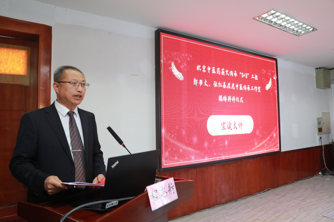 程志舫书记宣读《北京市中医管理局关于公布2023年基层老中医传承工作室立项建设名单的通知》批文。