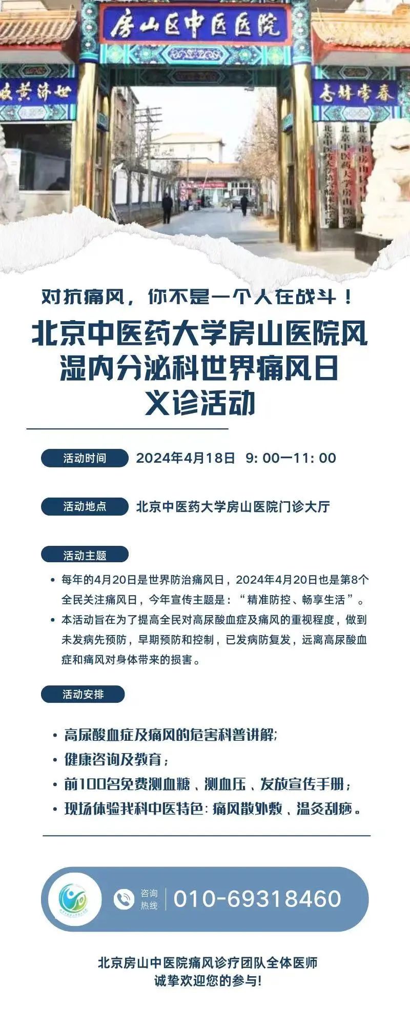 北京中医药大学房山医院风湿内分泌科将于4月18日开展义诊活动,让更多人通过科学的健康管理、早期预防和控制,远离高尿酸血症和痛风对身体带来的伤害。