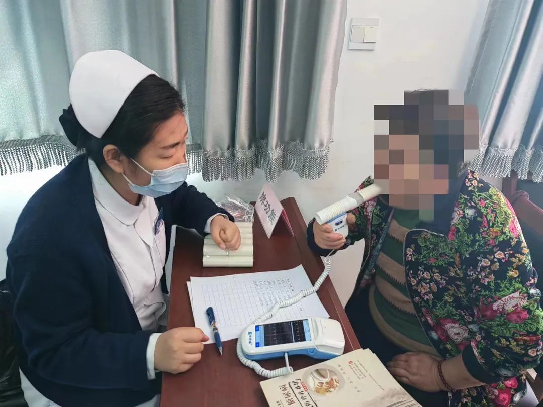 心血管病科郭环宇护士、检验科石昆鹏为患者测量血压、血糖。