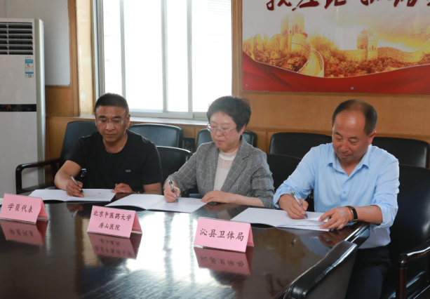 孙鲁英院长代表北京中医药大学房山医院与沁县卫体局李宏伟局长、“西学中”学员代表李少波签署了培训协议。