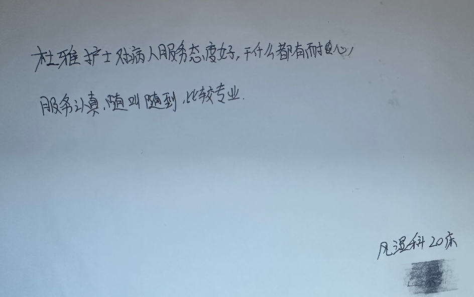 白衣天使们真挚的微笑,专业的护理,总能温暖患者心窝。“杜雅护士对病人服务态度好,干什么都有耐心,随叫随到,比较专业!”5月10日,北京中医药大学房山医院风湿病科收到赵女士的一封感谢信。