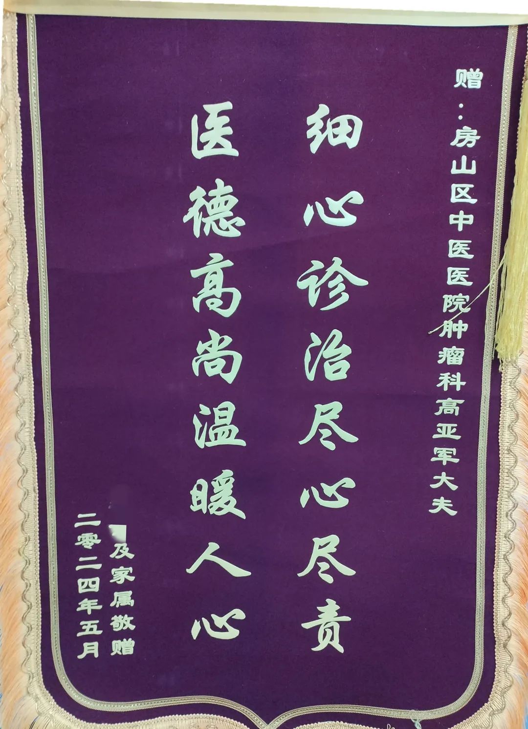 陈阿姨是一位小细胞肺癌患者,肝内多发转移,被很多大医院告知活不过一个月了。来到肿瘤科后,科室团队会诊讨论,充分评估患者的综合情况,制定了个体化的化疗方案,同时配合中医中药,最终患者完成4个周期的化疗。考虑陈阿姨心理承受力差,高亚军大夫还和患者家属编织了善意的谎言,让患者心理比较放松,加上治疗后患者生活质量明显改善,一家人度过了一段快乐的时光。家属给高大夫送上了锦旗,表达了由衷的感谢。