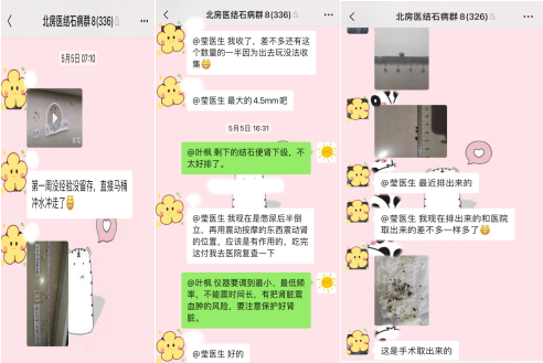 患者服药期间多次在结石科医患交流群联系我们,韩丽霞主任医师根据患者病情进行用药指导,我科医生对患者进行健康宣教。嘱患者收集排石,做成分分析,后期更有针对性的治疗和预防结石复发,患者检测结石成分为草酸钙结石。嘱患者定期监测肾功能恢复情况,患者肌酐已经恢复正常。指导患者做排石操及注意事项,促进结石排出。