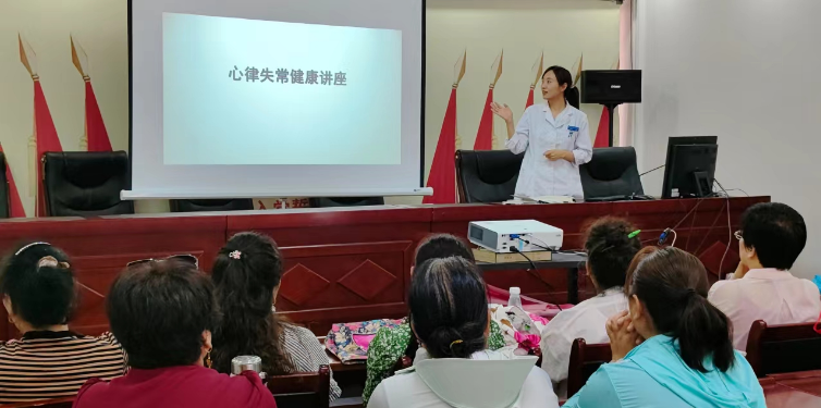 前街社区的社区志愿者负责布置会场和维持秩序,为义诊活动做好后勤保障工作。医院心血管病科王晶主治医师为居民开展心律失常健康讲座。