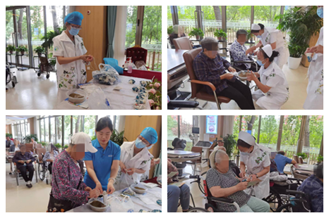 现场还提供了驱蚊避秽香囊,老人们亲手将药粉装入香囊内袋,再放到古色古香的外袋里,佩戴在身上,享受中药带来的清凉感。现场也弥漫着淡淡的芳香的药草味儿,为安静祥和的养老院填满了来自中医人的关爱。