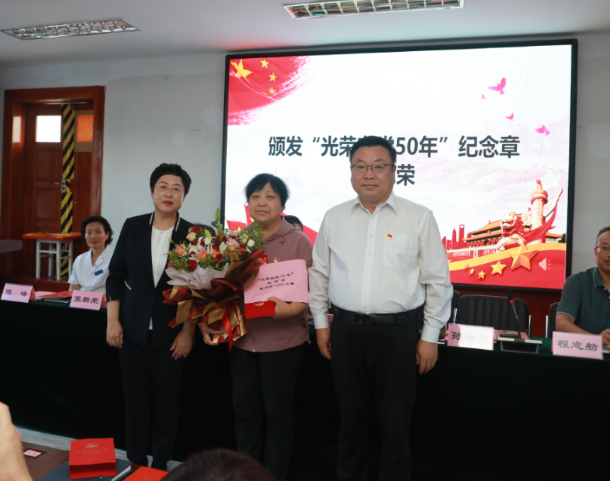 随后,党委书记郭书文、党委副书记、院长孙鲁英为张艳荣同志颁发“光荣在党50年”纪念章和慰问金,代表医院党委向她致以崇高敬意,张艳荣感谢党给予她这份荣誉,感谢领导的关心和爱护,并表示一颗红心永向党,愿意尽自己所能,继续发挥余热。