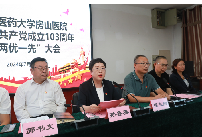 七月盛夏,骄阳似火,繁花似锦。为选树典型,表彰先进,进一步激发党员干部干事创业热情,发挥党员干部在工作中的先锋模范作用, 7月1日下午,北京中医药大学房山医院召开中国共产党成立103周年暨“两优一先”大会。院领导班子成员、党支部书记、“光荣在党50年”老党员代表、 优秀党务工作者、优秀共产党员、科室负责人、党员代表、积极分子、青年骨干近100人参加会议,医院党委副书记、院长孙鲁英主持会议。