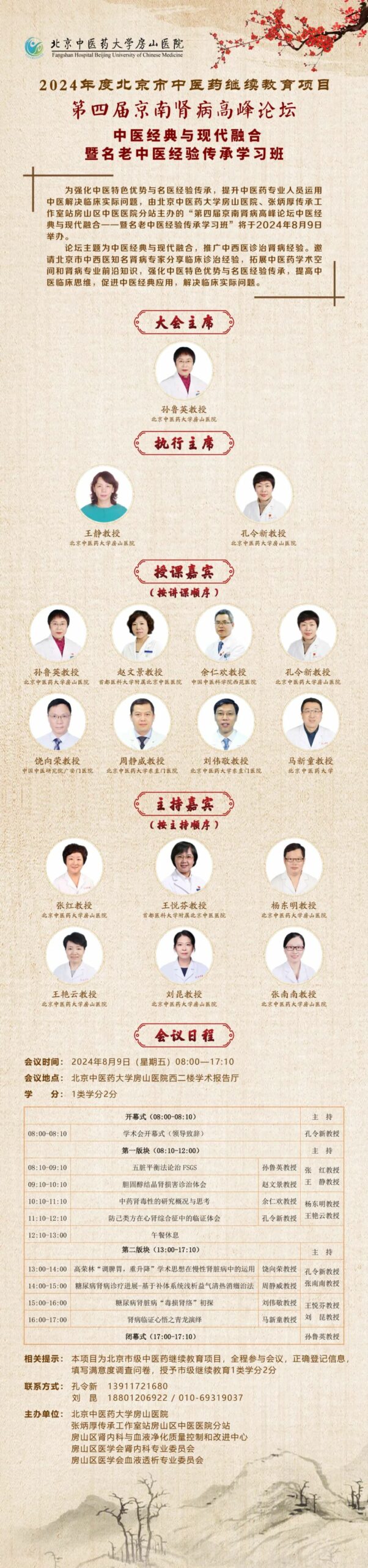 为强化中医特色优势与名医经验传承,提升中医药专业人员运用中医解决临床实际问题,由北京中医药大学房山医院、张炳厚传承工作室站房山区中医医院分站主办的“第四届京南肾病高峰论坛中医经典与现代融合——暨名老中医经验传承学习班”将于2024年8月9日举办。