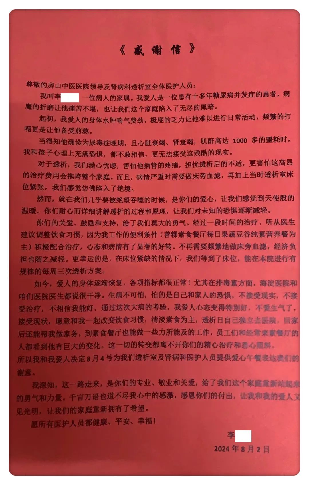 一滴水折射光辉,一封感谢信饱含深情。这封感谢信凝聚的是一份温暖,一份认可,一份信赖,更是一种责任。生活中没有那么多的诗情画意,也没有那么多暴风骤雨,却总有一幕幕平凡又感人的故事发生在透析中心,带给我们满满的正能量。