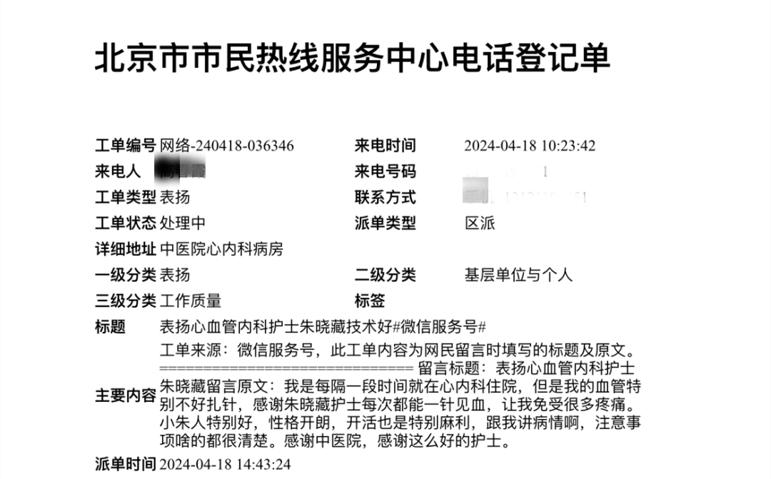 近日,北京中医药大学房山医院收到一份表扬工单:患者高某通过“12345”服务平台,公开表达对心血管病科护士朱晓藏精湛的技术和悉心照顾的感谢。