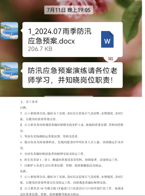 面对极端天气和可能发生的洪涝灾害,将保障患者安全放在首位。科室制定了防汛应急预案,并决定通过实战演练的方式,进一步磨合机制、锻炼队伍、提升能力。