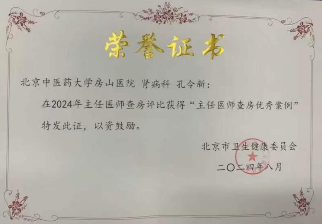 “主任医师查房优秀案例”获奖科室是中医经典病房建设科室肾病科,由孙鲁英院长担任学术带头人,孔令新任科主任,是临床、科研、教学一体化诊疗管理科室,是国家中医优势专科建设单位、北京“十四五”首批中医药重点专科。