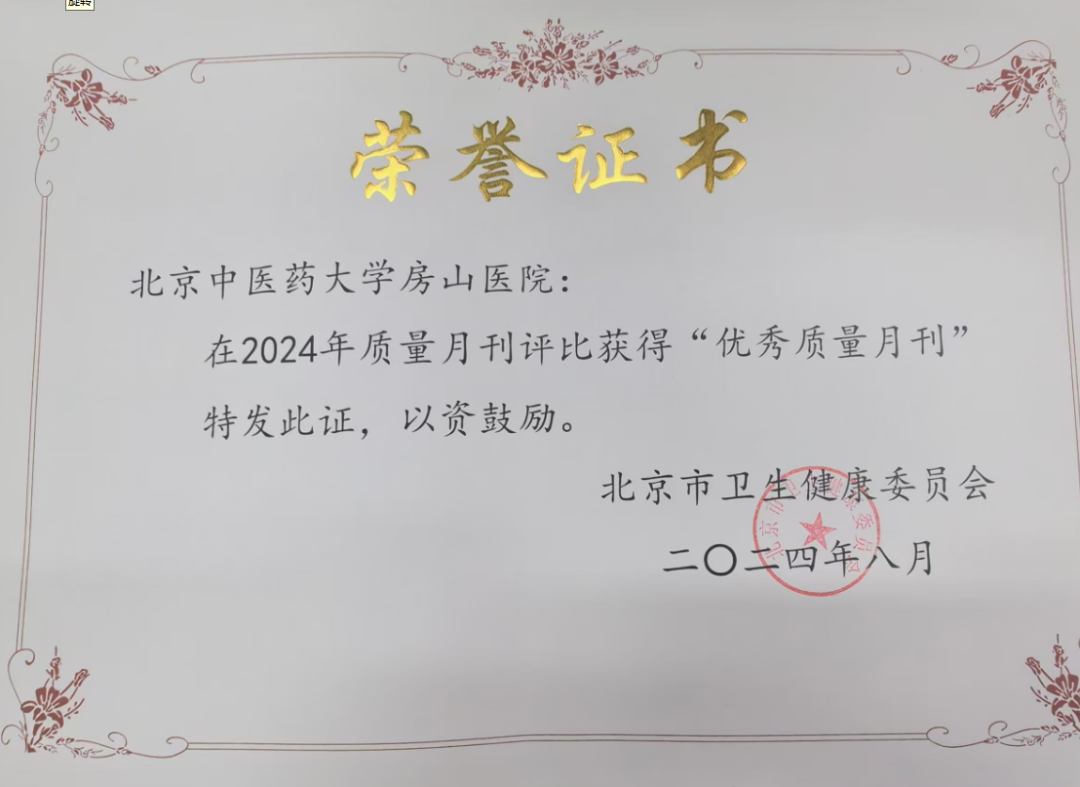 在第七个中国医师节到来之际,2024年8月16日,北京中医药大学房山医院荣获北京市卫生健康委员会颁发的“优秀质量月刊”和“主任医师查房优秀案例”。